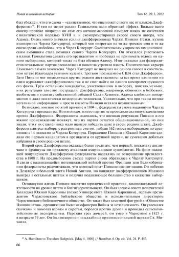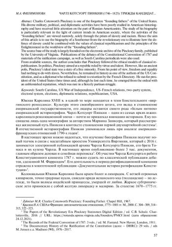 Южная Каролина XVIII в. в какой-то мере находится в тени блистательного «виргинского ренессанса». Культура этого своеобразного штата, его вклад в становление американской государственности, его лидеры остаются своего рода «белым пятном» американской историографии. Чарлз Котсуорт Пинкни – один из самых ярких южнокаролинцев революционной эпохи – почти не привлекал внимания историков. Ему посвящена лишь одна монография за авторством Марвина Занисера, который рассматривал жизненный путь Пинкни в контексте становления первой двухпартийной системы 1. В отечественной историографии Пинкни упоминался лишь при анализе американофранцузских отношений 1790-х годов