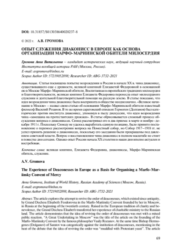 ГРОМОВА А. В. ОПЫТ СЛУЖЕНИЯ ДИАКОНИСС В ЕВРОПЕ КАК ОСНОВА ОРГАНИЗАЦИИ МАРФО-МАРИИНСКОЙ ОБИТЕЛИ МИЛОСЕРДИЯ // НОВАЯ И НОВЕЙШАЯ ИСТОРИЯ. 2022. № 3