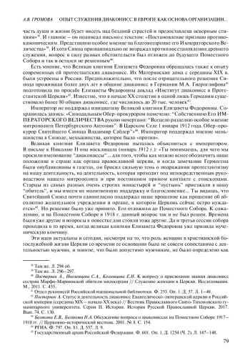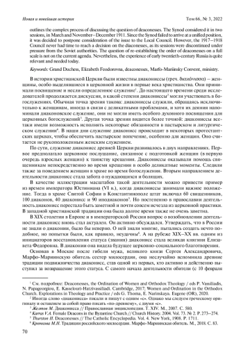 Статья посвящена попытке возрождения в России в начале ХХ в. чина диаконисс, существовавшего еще с древности, великой княгиней Елизаветой Федоровной в основанной ею в Москве Марфо-Мариинской обители. Воспитанная в европейских традициях милосердия и благотворительности, великая княгиня Елизавета Федоровна перенесла опыт милосердного служения и деятельной благотворительной помощи на русскую землю. В статье показано, что идея возрождения чина диаконисс была воспринята в обществе неоднозначно. «Великое начинание в Москве» – назвал свою статью об основании Марфо-Мариинской обители известный философ Василий Розанов. В то же время саратовский епископ Гермоген (Долганов) был категорически против института диаконисс, упомянув в пылу дискуссии, что идея возрождения чина «замешана на протестантских дрожжах». В статье обрисовывается сложный процесс обсуждения вопроса о диакониссах. Синод рассматривал его в два приема: в марте и ноябре–декабре 1911 г. Поскольку Синоду не удалось выработать единую позицию, было принято постановление о переносе рассмотрения вопроса на Поместный собор, но Собор 1917–1918 гг. не успел принять решение о диакониссах, поскольку его заседания были прекращены под давлением советской власти. Вопрос о восстановлении чина диаконисс в полном масштабе не стоит в повестке дня сегодня. Однако опыт России начала XX столетия в наши дни вполне актуален и востребован