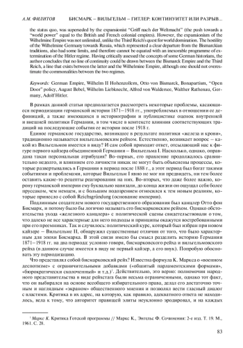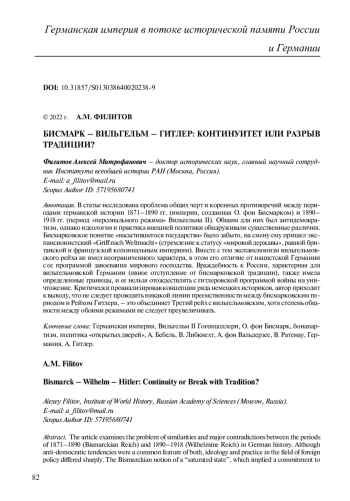 В статье исследована проблема общих черт и коренных противоречий между периодами германcкой истории 1871–1890 гг. (империя, созданная О. фон Бисмарком) и 1890– 1918 гг. (период «персонального режима» Вильгельма II). Общим для них был антидемократизм, однако идеология и практика внешней политики обнаруживали существенные различия. Бисмарковское понятие «насытившегося государства» было забыто, на смену ему пришел экспансионистский «Griff nach Weltmacht» (стремление к статусу «мировой державы», равной британской и французской колониальным империям). Вместе с тем экспансионизм вильгельмовского рейха не имел неограниченного характера, в этом его отличие от нацистской Германии с ее программой завоевания мирового господства. Враждебность к России, характерная для вильгельмовской Германии (явное отступление от бисмарковской традиции), также имела определенные границы, и ее нельзя отождествлять с гитлеровской программой войны на уничтожение. Критически проанализировав концепции ряда немецких историков, автор приходит к выводу, что не следует проводить никакой линии преемственности между бисмарковским периодом и Рейхом Гитлера, – это объединяет Третий рейх с вильгельмовским, хотя степень общности между обоими режимами не следует преувеличивать