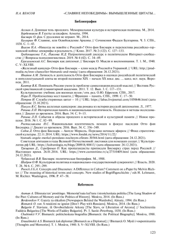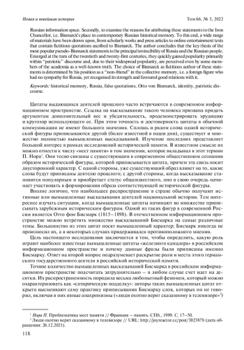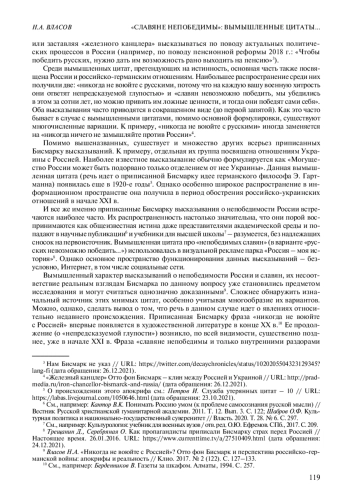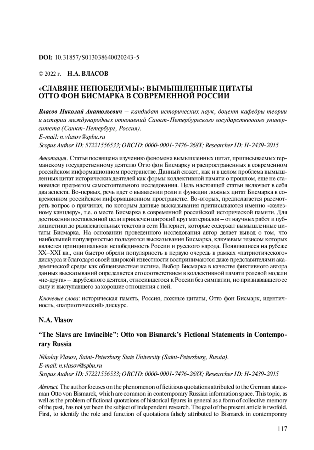 ВЛАСОВ Н. А. "СЛАВЯНЕ НЕПОБЕДИМЫ": ВЫМЫШЛЕННЫЕ ЦИТАТЫ ОТТО ФОН БИСМАРКА В СОВРЕМЕННОЙ РОССИИ // НОВАЯ И НОВЕЙШАЯ ИСТОРИЯ. 2022. № 3