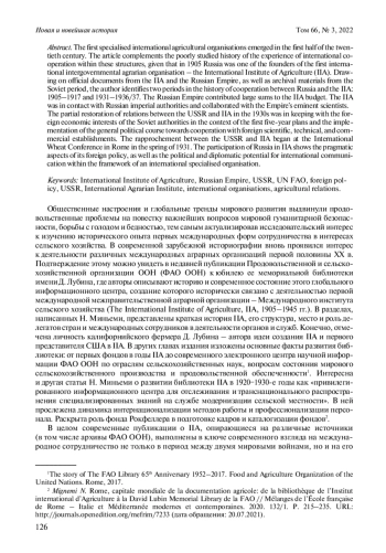 В первой половине XX в. получили развитие первые специализированные международные аграрные организации. Статья дополняет малоизвестную в историографии историческую картину опыта международного взаимодействия в рамках этих структур, ибо в 1905 г. Россия была одним из учредителей первой международной межправительственной аграрной организации – Международного института сельского хозяйства (International Institute of Agriculture, IIA). На основании официальных документов IIA и Российской империи, а также архивных материалов советского периода автор статьи выделяет два периода в истории сотрудничества России и IIA: 1905–1917 гг. и 1931–1936/37 гг. Российская империя вносила большие суммы в бюджет IIA. С IIA взаимодействовали государственные органы и сотрудничали выдающиеся ученые империи. Частичное восстановление отношений СССР и IIA в 1930-е годы соответствовало внешнеэкономическим интересам советской власти в условиях выполнения планов первых пятилеток и реализации общего политического курса на сотрудничество с зарубежными научно-техническими и коммерческими кругами. Начало сближения СССР и IIA произошло на международной зерновой конференции в Риме весной 1931 г. Участие России в деятельности IIA показывает прагматические аспекты ее внешней политики, а также политические и дипломатические возможности международного общения в рамках международной специализированной организации