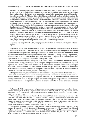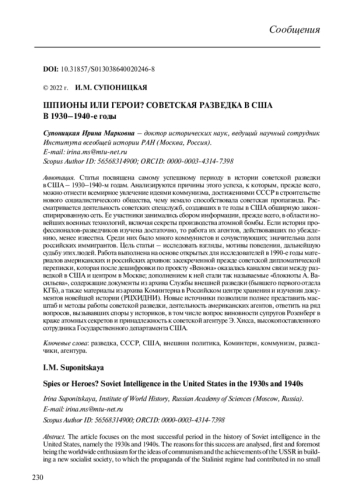 СУПОНИЦКАЯ И. М. ШПИОНЫ ИЛИ ГЕРОИ? СОВЕТСКАЯ РАЗВЕДКА В США В 1930-1940-Е ГОДЫ // НОВАЯ И НОВЕЙШАЯ ИСТОРИЯ. 2022. № 3