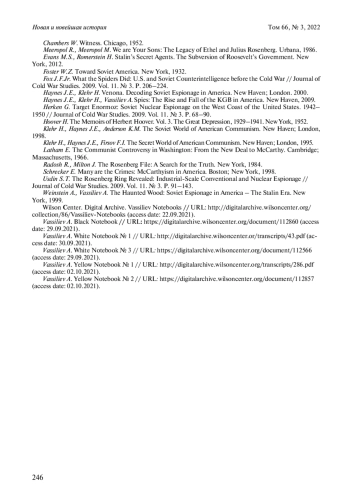 Статья посвящена самому успешному периоду в истории советской разведки в США – 1930–1940-м годам. Анализируются причины этого успеха, к которым, прежде всего, можно отнести всемирное увлечение идеями коммунизма, достижениями СССР в строительстве нового социалистического общества, чему немало способствовала советская пропаганда. Рассматривается деятельность советских спецслужб, создавших в те годы в США обширную законспирированную сеть. Ее участники занимались сбором информации, прежде всего, в области новейших военных технологий, включая секреты производства атомной бомбы. Если история профессионалов-разведчиков изучена достаточно, то работа их агентов, действовавших по убеждению, менее известна. Среди них было много коммунистов и сочувствующих; значительна доля российских иммигрантов. Цель статьи – исследовать взгляды, мотивы поведения, дальнейшую судьбу этих людей. Работа выполнена на основе открытых для исследователей в 1990-е годы материалов американских и российских архивов: засекреченной прежде советской дипломатической переписки, которая после дешифровки по проекту «Венона» оказалась каналом связи между разведкой в США и центром в Москве; дополнением к ней стали так называемые «блокноты А. Васильева», содержащие документы из архива Службы внешней разведки (бывшего первого отдела КГБ), а также материалы из архива Коминтерна в Российском центре хранения и изучения документов новейшей истории (РЦХИДНИ). Новые источники позволили полнее представить масштаб и методы работы советской разведки, деятельность американских агентов, ответить на ряд вопросов, вызывавших споры у историков, в том числе вопрос виновности супругов Розенберг в краже атомных секретов и принадлежность к советской агентуре Э. Хисса, высокопоставленного сотрудника Государственного департамента США.