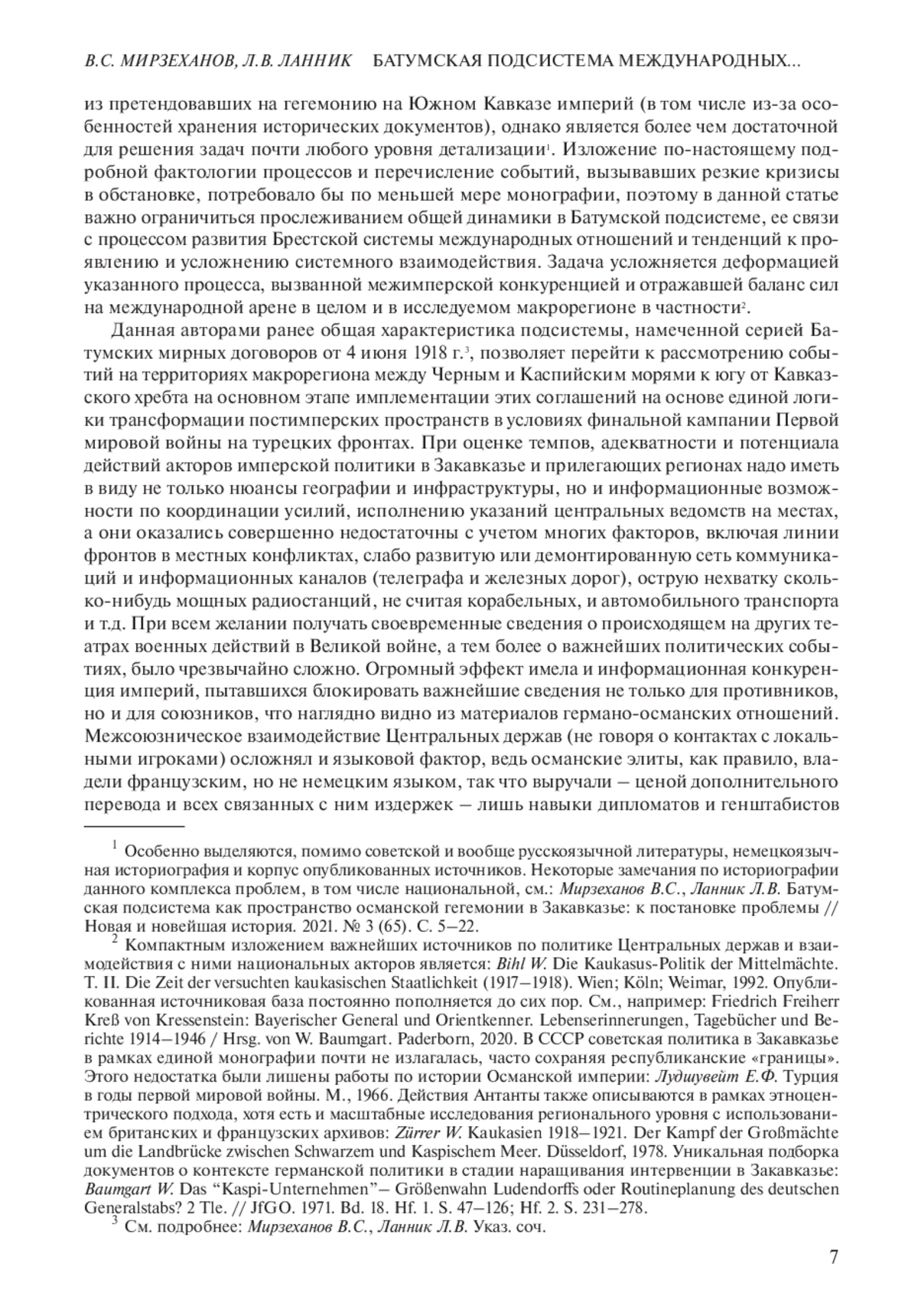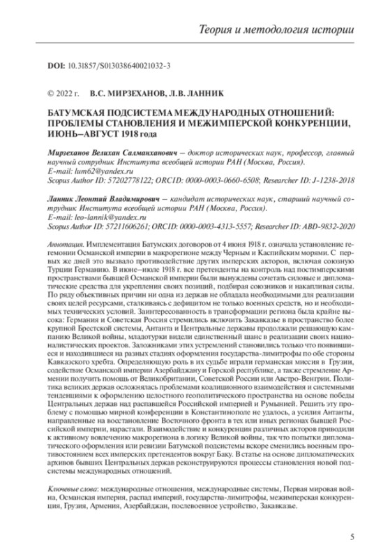 13. Мирзеханов В.С., Ланник Л.В. Батумская подсистема как пространство османской гегемонии в Закавказье: к постановке проблемы // Новая и новейшая история. 2021. № 3 (65). С. 5-22. EDN: DTYHSX