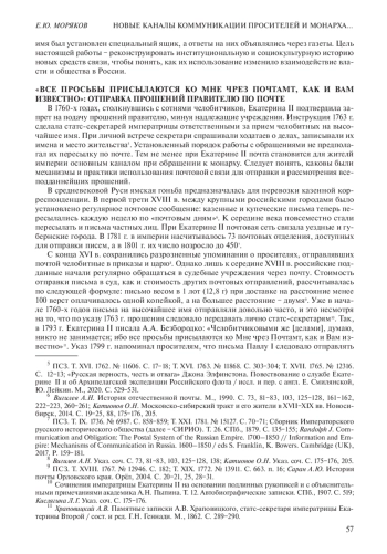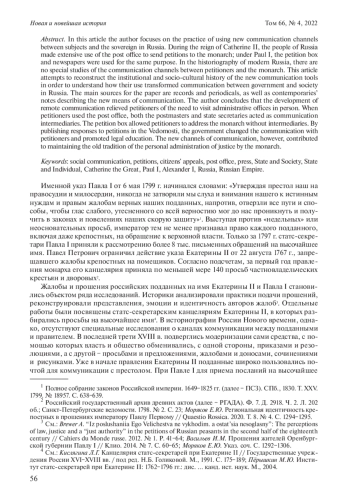 Статья посвящена истории появления и практикам использования новых каналов коммуникации подданных и правителя в России. При Екатерине II жители России широко пользовались почтой для отправки прошений правителю, а при Павле I для этой цели стали применяться ящик для прошений и газеты. В историографии России Нового времени отсутствуют специальные исследования о каналах коммуникации ходатаев и монарха. Цель статьи – реконструировать институциональную и социокультурную историю новых средств связи, чтобы понять, как их использование изменило коммуникацию власти и общества в России. Основными источниками работы являются материалы делопроизводства и периодической печати, а также записки современников, в которых описываются новые средства связи. Как показало исследование, развитие дистанционной связи избавило просителей от необходимости лично посещать присутственные места. При использовании ходатаями почты их письма доставлялись монарху через почтмейстеров статс-секретарями. Появление ящика для прошений предоставило подданным возможность обратиться к монарху «беспосредственно». С помощью публикации ответов на прошения в «Санкт-Петербургских ведомостях» и «Московских ведомостях» правительство корректировало коммуникацию с челобитчиками и способствовало правовому просвещению. Новые каналы связи, однако, служили поддержанию старой традиции персонального отправления правосудия монархом
