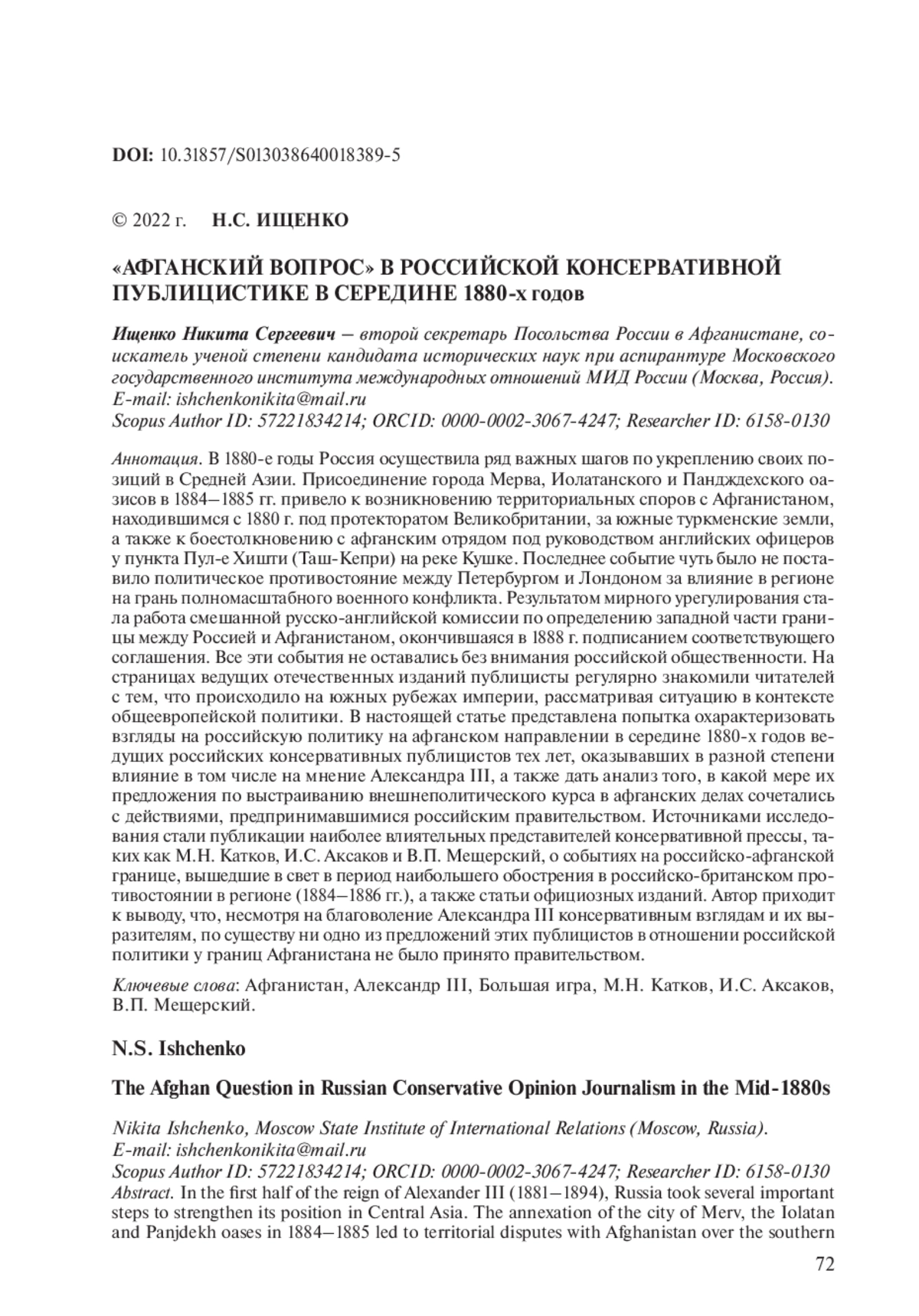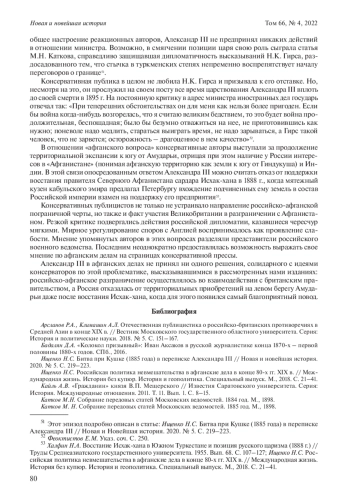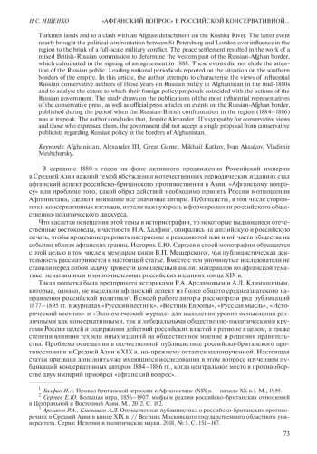 В 1880-е годы Россия осуществила ряд важных шагов по укреплению своих позиций в Средней Азии. Присоединение города Мерва, Иолатанского и Пандждехского оазисов в 1884–1885 гг. привело к возникновению территориальных споров с Афганистаном, находившимся с 1880 г. под протекторатом Великобритании, за южные туркменские земли, а также к боестолкновению с афганским отрядом под руководством английских офицеров у пункта Пул-е Хишти (Таш-Кепри) на реке Кушке. Последнее событие чуть было не поставило политическое противостояние между Петербургом и Лондоном за влияние в регионе на грань полномасштабного военного конфликта. Результатом мирного урегулирования стала работа смешанной русско-английской комиссии по определению западной части границы между Россией и Афганистаном, окончившаяся в 1888 г. подписанием соответствующего соглашения. Все эти события не оставались без внимания российской общественности. На страницах ведущих отечественных изданий публицисты регулярно знакомили читателей с тем, что происходило на южных рубежах империи, рассматривая ситуацию в контексте общеевропейской политики. В настоящей статье представлена попытка охарактеризовать взгляды на российскую политику на афганском направлении в середине 1880-х годов ведущих российских консервативных публицистов тех лет, оказывавших в разной степени влияние в том числе на мнение Александра III, а также дать анализ того, в какой мере их предложения по выстраиванию внешнеполитического курса в афганских делах сочетались с действиями, предпринимавшимися российским правительством. Источниками исследования стали публикации наиболее влиятельных представителей консервативной прессы, таких как М. Н. Катков, И. С. Аксаков и В. П. Мещерский, о событиях на российско-афганской границе, вышедшие в свет в период наибольшего обострения в российско-британском противостоянии в регионе (1884–1886 гг.), а также статьи официозных изданий. Автор приходит к выводу, что, несмотря на благоволение Александра III консервативным взглядам и их выразителям, по существу ни одно из предложений этих публицистов в отношении российской политики у границ Афганистана не было принято правительством.