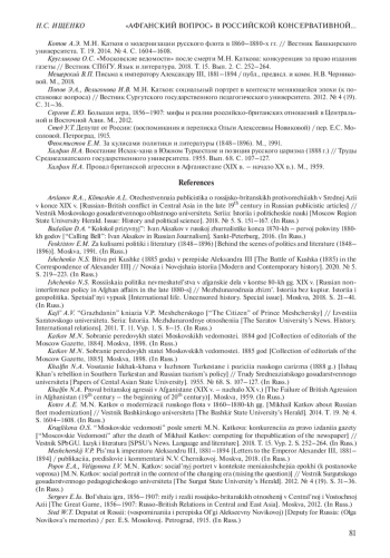 1. Арсланов Р.А., Климашин А.Л. Отечественная публицистика о российско-британских противоречиях в Средней Азии в конце XIX в. // Вестник Московского государственного областного университета. Серия: История и политические науки. 2018. № 5. С. 151-167. EDN: YTATZB