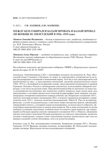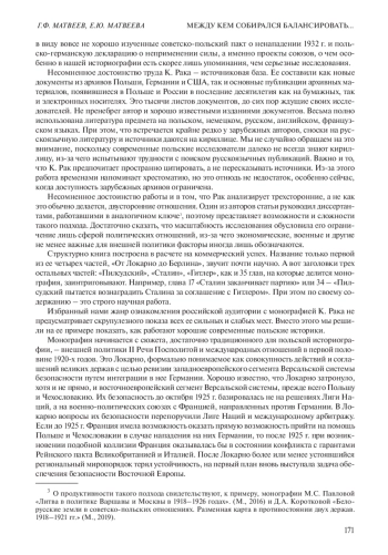 В 2021 г. независимый польский исследователь Кшиштоф Рак опубликовал монографию «Пилсудский между Сталиным и Гитлером», не оставшуюся незамеченной в Польше уже хотя бы в силу вынесенных на обложку книги фамилий трех политиков, сыгравших судьбоносную роль в судьбе поляков в первой половине ХХ в. Это не первая работа К. Рака, в 2019 г. из печати вышла его книга «Польша – несостоявшийся союзник Гитлера»1. Анализируемый объемный труд К. Рака, насчитывающий около 1000 страниц текста, хронологически охватывает период от преддверия Локарно до начала 1935 г. Он затрагивает множество сюжетов, каждый из которых тянет на самостоятельное исследование. В центре внимания автора – взаимоотношения в треугольнике Варшава – Берлин – Москва, но немало места занимает и анализ французского фактора в польской внешней политике