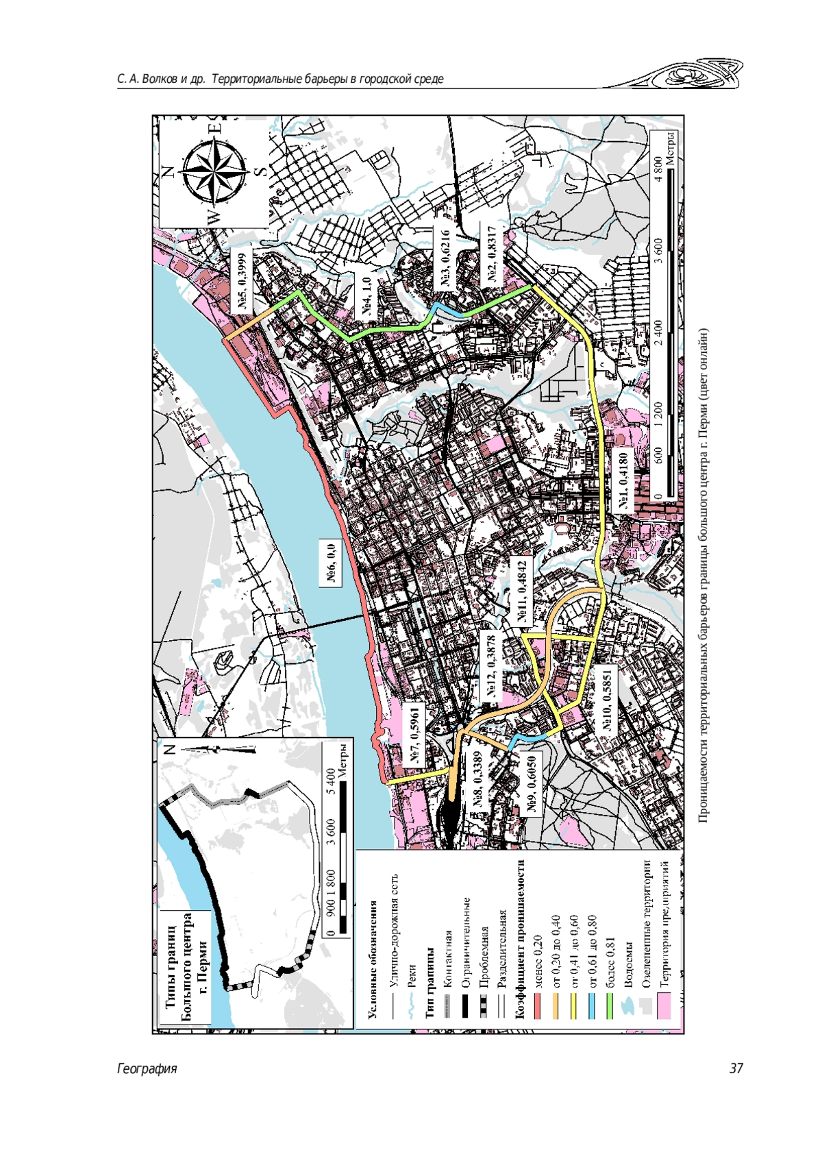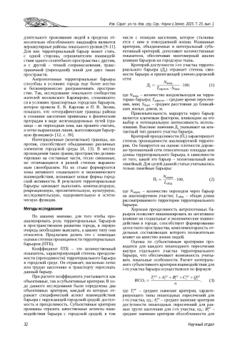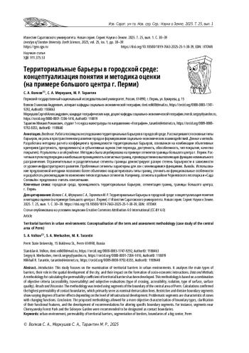 Введение. Работа посвящена исследованию территориальных барьеров в городской среде. Рассматриваются основные типы барьеров, их роль в пространственном развитии города и формировании социально-экономических взаимодействий. Данные и методы. Разработана методика расчета коэффициента проницаемости территориальных барьеров, основанная на комбинации объективных критериев (доступность, преодолимость) и субъективных оценок (тип перехода, доступность, обособленность, тип покрытия, качество покрытия). Результаты и их обсуждение. Методика была апробирована на примере сегментов границы большого центра г. Перми. Расчетным путем подтверждена наибольшая проницаемость контактных границ, преимущественно выполняющих функцию номинального разграничения. Ограничительные и разделительные сегменты границы демонстрируют разную степень барьерности в зависимости от уровня инфраструктурного развития. Проблемные сегменты характерны для зон с меняющимися функциями.