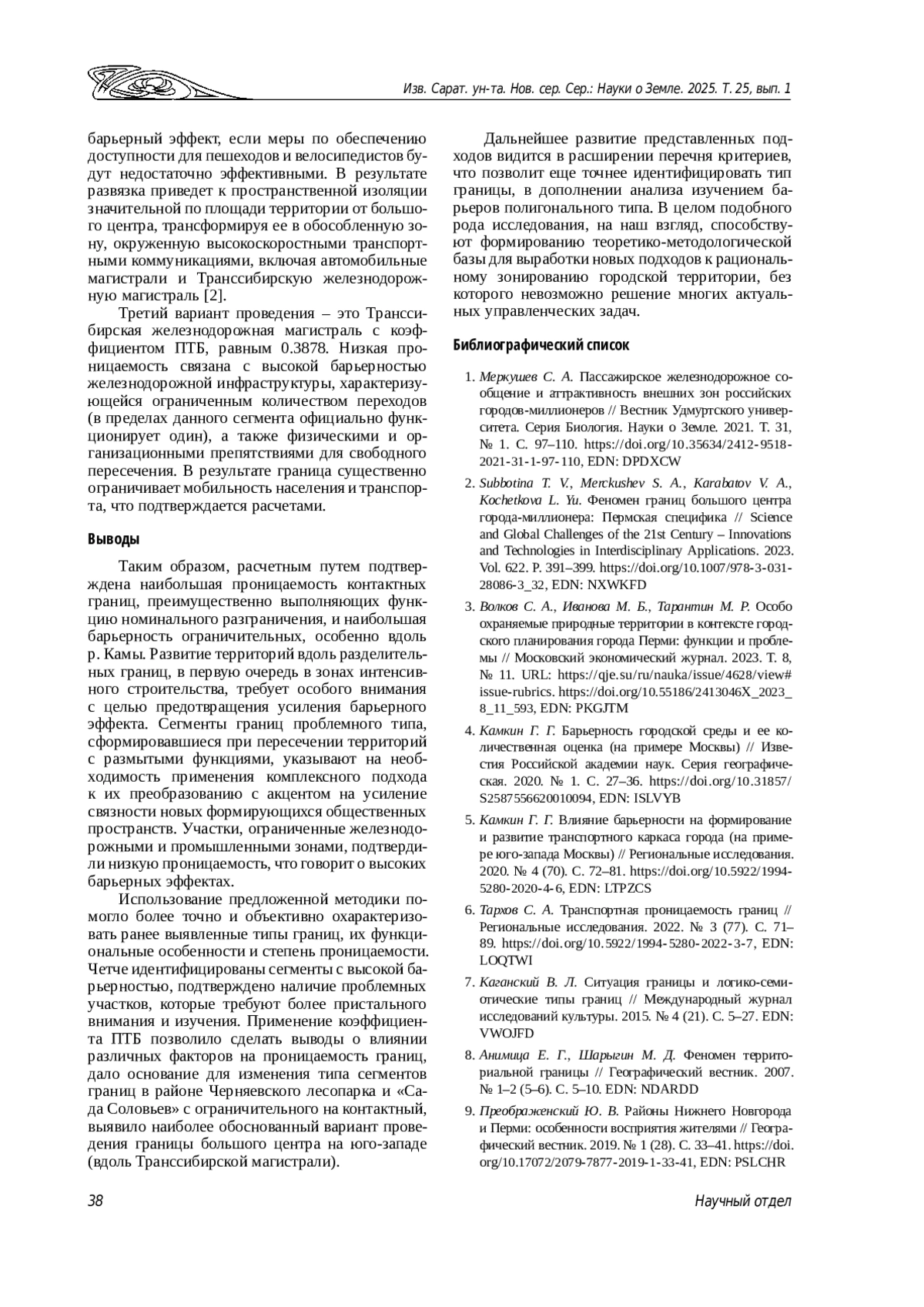 1. Меркушев С. А. Пассажирское железнодорожное сообщение и аттрактивность внешних зон российских городов-миллионеров // Вестник Удмуртского университета. Серия Биология. Науки о Земле. 2021. Т. 31, № 1. С. 97-110. ,. DOI: 10.35634/2412-9518-2021-31-1-97-110 EDN: DPDXCW