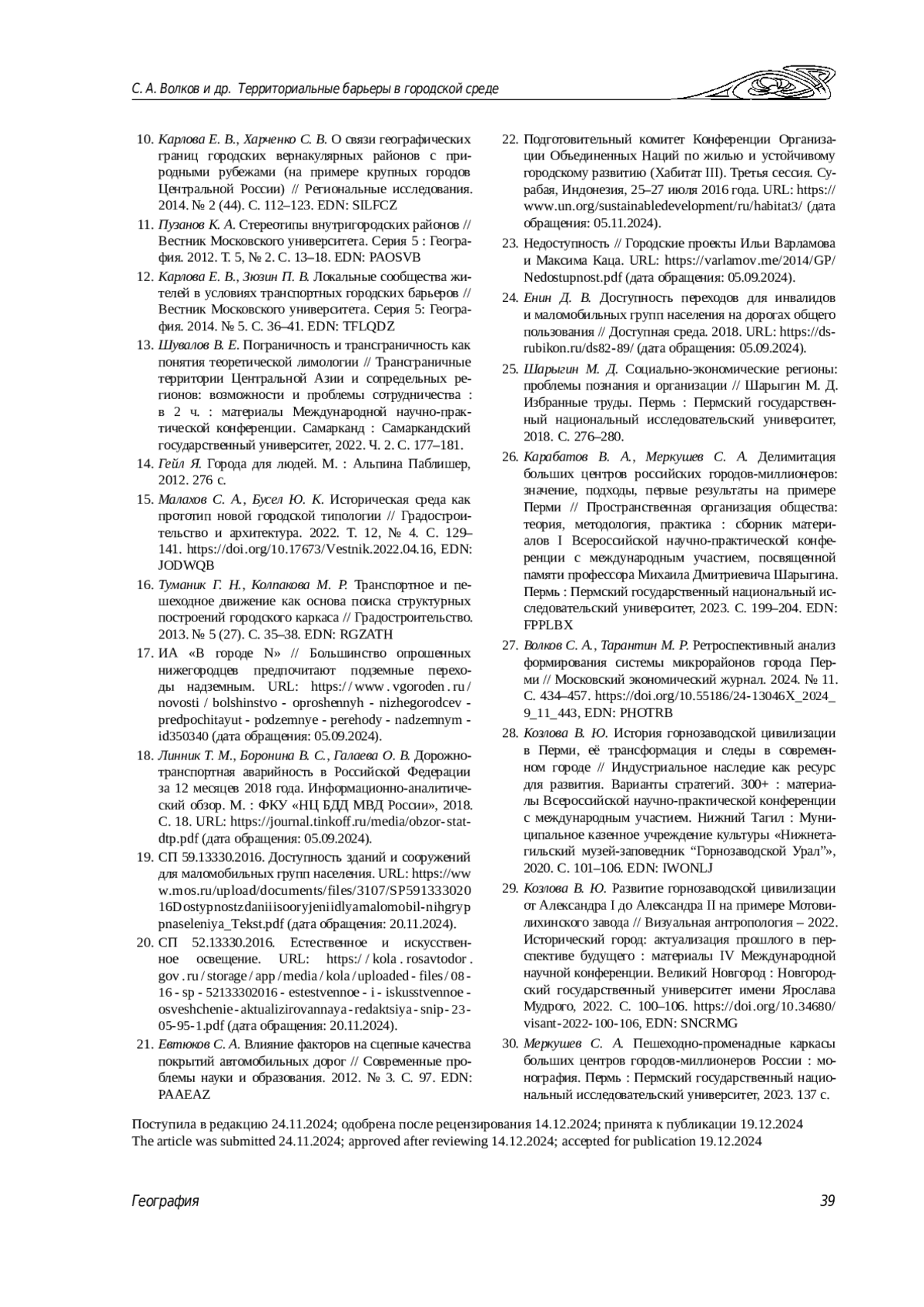 12. Карлова Е. В., Зюзин П. В. Локальные сообщества жителей в условиях транспортных городских барьеров // Вестник Московского университета. Серия 5: География. 2014. № 5. С. 36-41. EDN: TFLQDZ