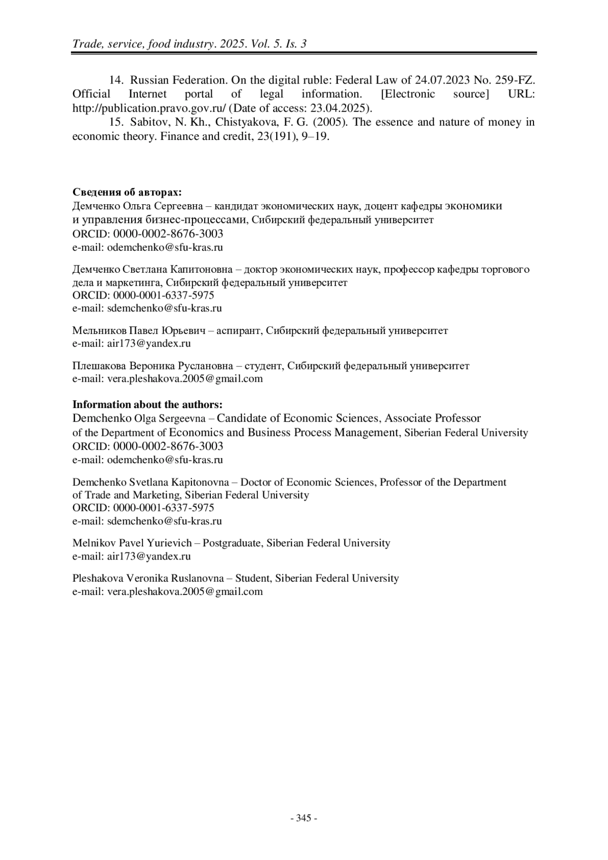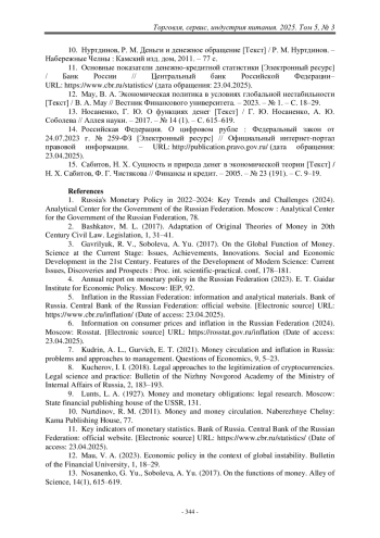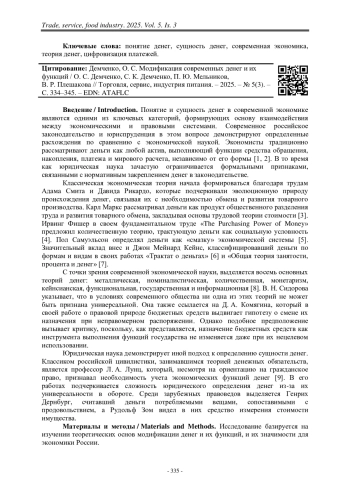 ДЕМЧЕНКО О. С., ДЕМЧЕНКО С. К., МЕЛЬНИКОВ П. Ю., ПЛЕШАКОВА В. Р. МОДИФИКАЦИЯ СОВРЕМЕННЫХ ДЕНЕГ И ИХ ФУНКЦИЙ // ТОРГОВЛЯ, СЕРВИС, ИНДУСТРИЯ ПИТАНИЯ. 2025. № 3, ТОМ 5