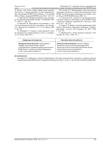 ЖАЛМУРЗИН Р. Б. СОДЕРЖАНИЕ ПРОЦЕССА ФОРМИРОВАНИЯ ЭТИЧЕСКОЙ ОТВЕТСТВЕННОСТИ КУРСАНТОВ В УСЛОВИЯХ ОБУЧЕНИЯ В ВЕДОМСТВЕННОМ ВУЗЕ ФСИН РОССИИ // САМАРСКИЙ НАУЧНЫЙ ВЕСТНИК. 2024. ТОМ 13, № 1