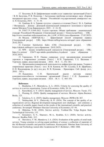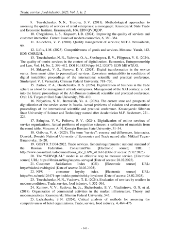 23. Терещенко, Н. Н. Оценка сервисных услуг предприятиями розничной торговли в современных условиях [Текст] / Н. Н. Терещенко, Т. Е. Васинева // Торговля, сервис, индустрия питания. – 2024. – № 4. – С. 352–361.