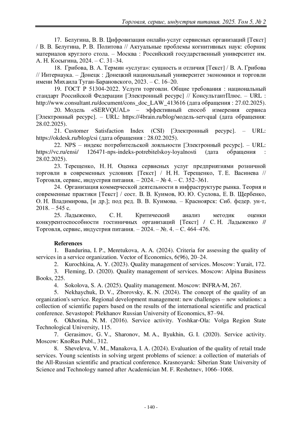 1. Бандурина, И. П. Критерии оценки качества услуг в сервисной организации [Текст] / И. П. Бандурина, А. А. Меретукова // Вектор экономики. – 2024. – № 6(96). – С. 20–24.