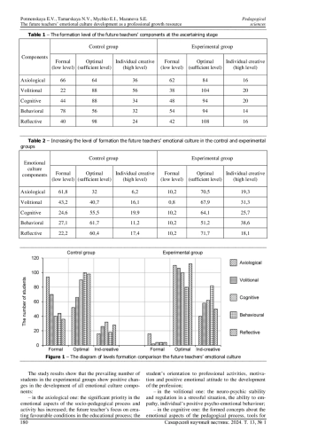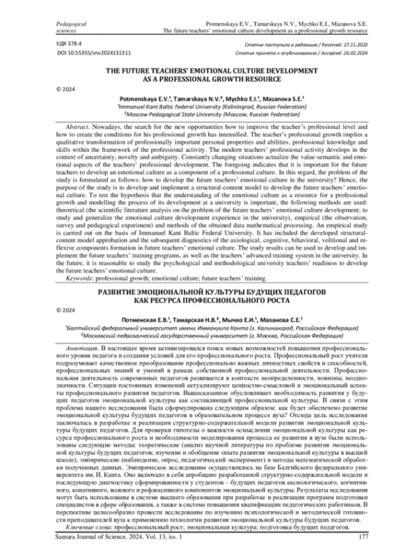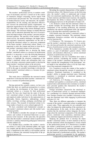 1. Потменская Е.В. Герменевтико-педагогическая концепция формирования эмоциональной культуры будущих педагогов в образовательном процессе университета: автореф. дис. … д-ра пед. наук. Калининград, 2022. 42 с. EDN: OJTCLM