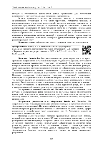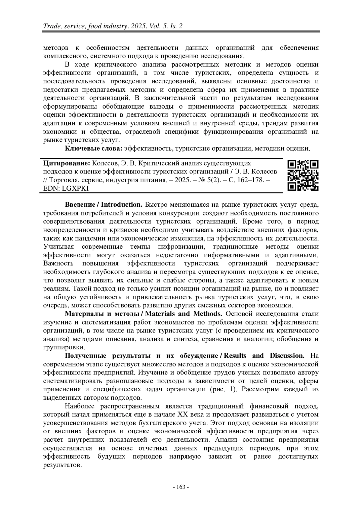 Быстро меняющаяся на рынке туристских услуг среда, требования потребителей и условия конкуренции создают необходимость постоянного совершенствования деятельности туристских организаций. Кроме того, в период неопределенности и кризисов необходимо учитывать воздействие внешних факторов, таких как пандемии или экономические изменения, на эффективность их деятельности. Учитывая современные темпы цифровизации, традиционные методы оценки эффективности могут оказаться недостаточно информативными и адаптивными. Важность повышения эффективности туристских организаций подчеркивает необходимость глубокого анализа и пересмотра существующих подходов к ее оценке, что позволит выявить их сильные и слабые стороны, а также адаптировать к новым реалиям. Такой подход не только усилит позиции организаций на рынке, но и повлияет на общую устойчивость и привлекательность рынка туристских услуг, что, в свою очередь, может способствовать развитию других смежных секторов экономики.