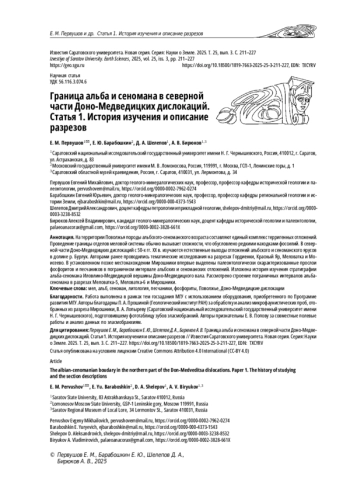 ПЕРВУШОВ Е. М., БАРАБОШКИН Е. Ю., ШЕЛЕПОВ Д. А., БИРЮКОВ А. В. ГРАНИЦА АЛЬБА И СЕНОМАНА В СЕВЕРНОЙ ЧАСТИ ДОНО-МЕДВЕДИЦКИХ ДИСЛОКАЦИЙ. СТАТЬЯ 1. ИСТОРИЯ ИЗУЧЕНИЯ И ОПИСАНИЕ РАЗРЕЗОВ // ИЗВЕСТИЯ САРАТОВСКОГО УНИВЕРСИТЕТА. НОВАЯ СЕРИЯ. СЕРИЯ НАУКИ О ЗЕМЛЕ. 2025. Т. 25 № 3