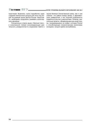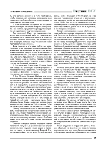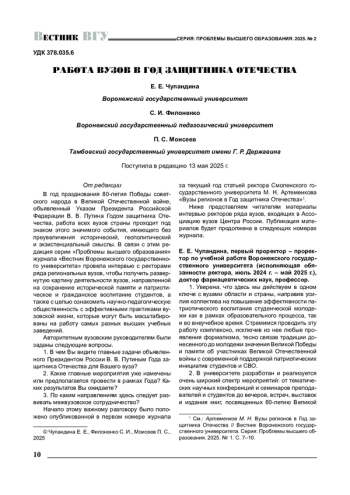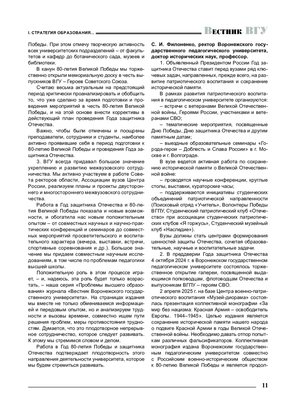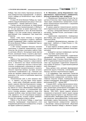 В год празднования 80-летия Победы советского народа в Великой Отечественной войне, объявленный Указом Президента Российской Федерации В. В. Путина Годом защитника Отечества, работа всех вузов страны проходит под знаком этого значимого события, имеющего без преувеличения исторический, геополитический и экзистенциальный смыслы. В связи с этим редакция серии «Проблемы высшего образования» журнала «Вестник Воронежского государственного университета» провела интервью с ректорами ряда региональных вузов, чтобы получить развернутую картину деятельности вузов, направленной на сохранение исторической памяти и патриотическое и гражданское воспитание студентов, а также с целью ознакомить научно-педагогическую общественность с эффективными практиками вузовской жизни, которые могут быть масштабированы на работу самых разных высших учебных заведений.