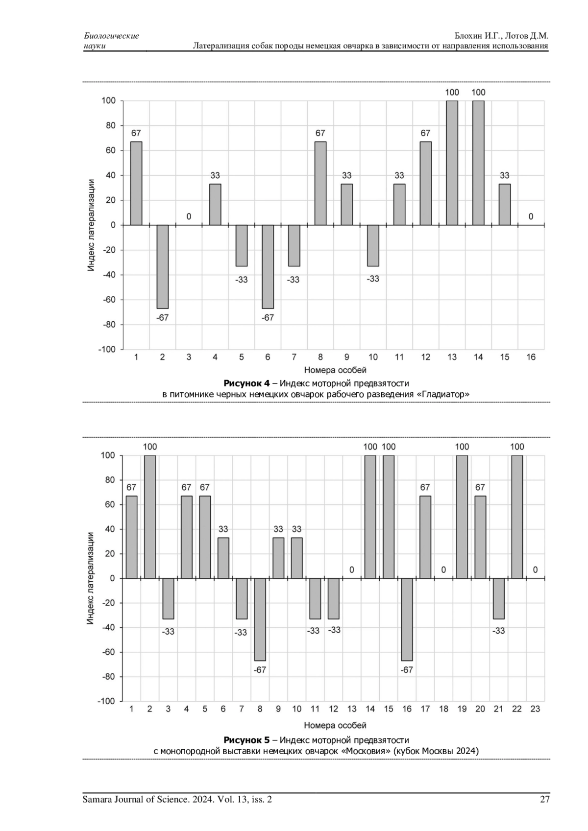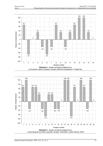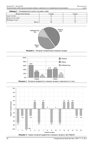 В данной статье рассматривается моторная латерализация собак породы немецкая овчарка. Выявление подобных взаимосвязей может способствовать более эффективному выявлению предрасположенностей собак к различным видам работы и более эффективной подготовке рабочих собак. Целью работы является выявление связи между направлением использования собак породы немецкая овчарка и их латерализованным поведением. С помощью метода первого шага были собраны данные о моторной предвзятости 55 собак разного пола и возраста, а также рассчитан индекс латерализации. Собаки были разделены на три группы: из центра кинологической службы МВД по Вологодской области, из питомника черных немецких овчарок «Гладиатор» и участники монопородной выставки немецких овчарок «Московия» в 2024 году. Было выявлено, что для большинства собак характерна праволапость, её демонстрирует 49%, однако ведущая конечность собак различается в зависимости от пола животных: 64% самцов оказались правшами, 44% самок - левшами, при этом доля амбидекстров больше среди самок (15%), чем среди самцов (9%). Помимо этого, для собак, работающих в МВД, отмечена тенденция к преобладанию левшей (56% особей), а среди собак из питомника «Гладиатор» и участников выставки «Московия» преобладали правши (56 и 57% соответственно).
