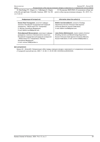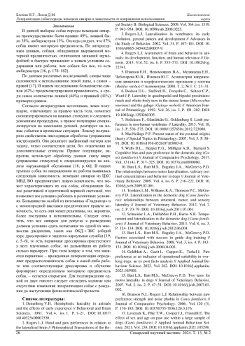 11. Tomkins L.M., Williams K.A., Thomson P.C., McGreevy P.D. Lateralization in the domestic dog (Canis familiaris): relationships between structural, motor, and sensory laterality // Journal of Veterinary Behavior. 2012. Vol. 7, iss. 2. P. 70-79. DOI: 10.1016/j.jveb.2011.07.001