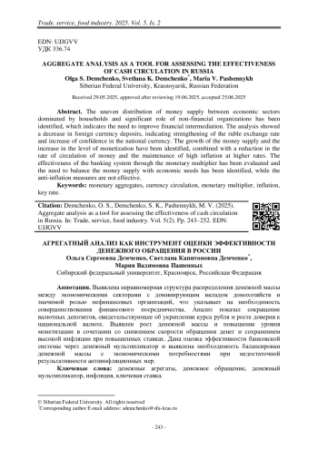 Выявлена неравномерная структура распределения денежной массы между экономическими секторами с доминирующим вкладом домохозяйств и значимой ролью нефинансовых организаций, что указывает на необходимость совершенствования финансового посредничества. Анализ показал сокращение валютных депозитов, свидетельствующее об укреплении курса рубля и росте доверия к национальной валюте. Выявлен рост денежной массы и повышение уровня монетизации в сочетании со снижением скорости обращения денег и сохранением высокой инфляции при повышенных ставках. Дана оценка эффективности банковской системы через денежный мультипликатор и выявлена необходимость балансировки денежной массы с экономическими потребностями при недостаточной результативности антиинфляционных мер.