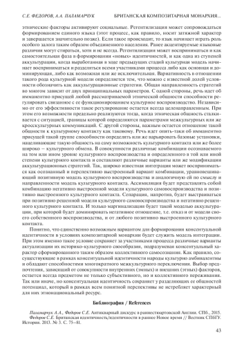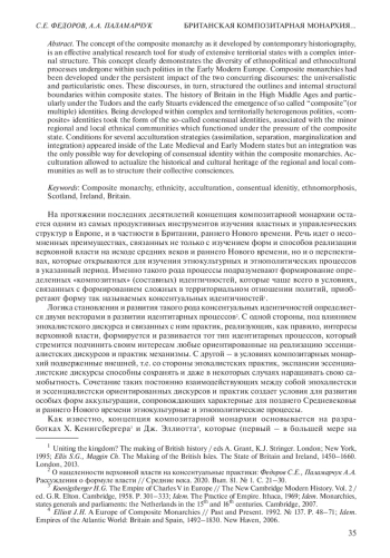 Концепция композитарной монархии – выработанный в современной историографии аналитический инструмент для изучения крупноразмерных, структурно сложных государственных образований и происходящих в них этнокультурных и этнополитических процессов. Композитарные монархии развивались в условиях конкуренции универсалистского и партикуляристского дискурсов, определявших конфигурацию их внешних контуров и внутренних структур. История Британии с классического Средневековья и до правления Тюдоров и Стюартов свидетельствует о процессе формирования «композитных» (составных) идентичностей, которые в рамках сложных в территориальном отношении политий принимают форму консентуальных идентичностей, связанных с этническими общностями второго плана. Внутри композитарных политий возникают условия для реализации различных стратегий аккультурации. Выделяют следующие модификации аккультурационных стратегий: ассимиляция, сепарация, маргинализация и интеграция. Единственно возможным вариантом для формирования консентуальной идентичности в условиях композитарной монархии является модель интеграции. Интеграция позволяет композитам, вовлеченным в процесс этноморфоза, различными путями актуализировать собственное историко-культурное наследие и структурировать коллективное самосознание. Неоднородная структура композитарной монархии при Тюдорах и первых Стюартах предполагала, что стратегия интеграции задействует административные и интеллектуальные механизмы, разнящиеся для композитов британской периферии – Уэльса, Ирландии и Шотландии.