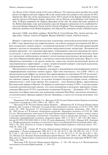 Ключевые фразы: СССР, АНТИГИТЛЕРОВСКАЯ КОАЛИЦИЯ, ВТОРАЯ МИРОВАЯ ВОЙНА, ВЕЛИКАЯ ОТЕЧЕСТВЕННАЯ ВОЙНА, церковь и государство, внешняя политика, ВАТИКАН, АНГЛИКАНСКАЯ ЦЕРКОВЬ, РУССКАЯ ПРАВОСЛАВНАЯ ЦЕРКОВЬ, исторические источники