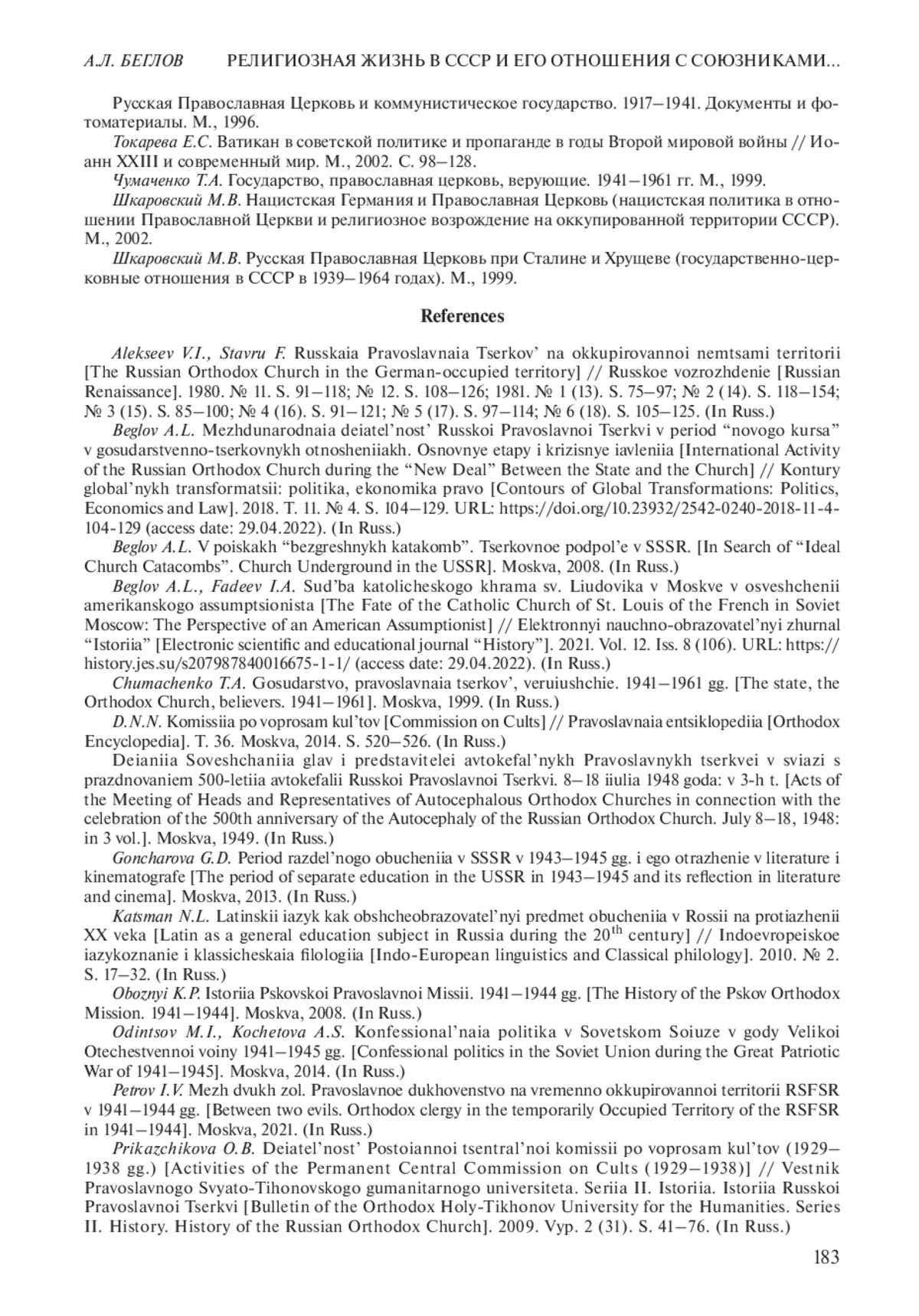 БЕГЛОВ А. Л. РЕЛИГИОЗНАЯ ЖИЗНЬ В СССР И ЕГО ОТНОШЕНИЯ С СОЮЗНИКАМИ В 1943 ГОДУ ГЛАЗАМИ АМЕРИКАНСКОГО АССУМПЦИОНИСТА // НОВАЯ И НОВЕЙШАЯ ИСТОРИЯ. 2022. № 5