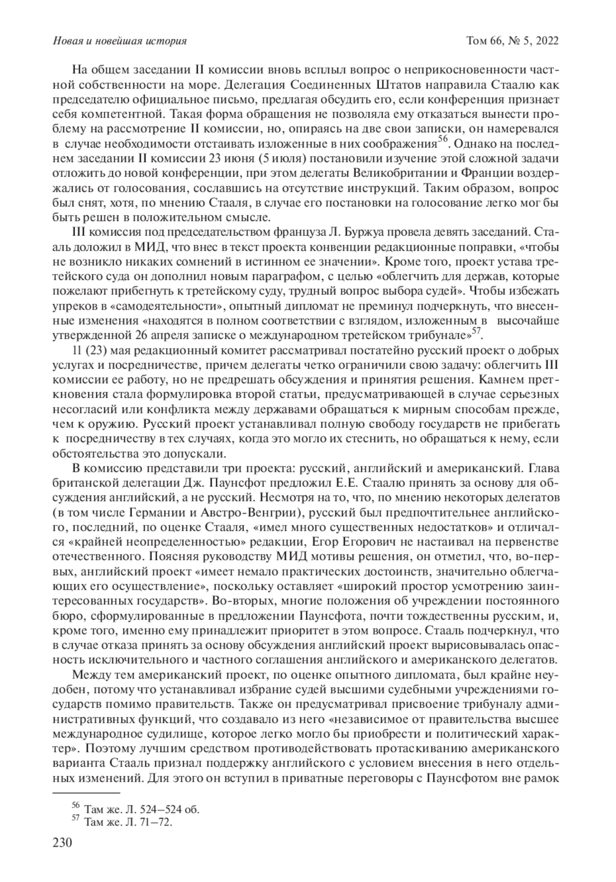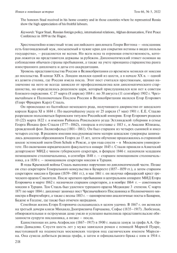 Один из старейших российских дипломатов Е. Е. Стааль значительную часть карьеры являлся чрезвычайным и полномочным послом при королеве Великобритании и Ирландии, императрице Индии. Он внес существенный вклад в стабилизацию русско-английских отношений. Это был период острых конфликтов и кризисов на международной арене середины 80-х – конца 90-х годов XIX в. Специальных исследований, посвященных Стаалю, пока не опубликовано. Ограниченные рамки статьи не позволяют представить полную картину его деятельности на дипломатическом поприще. Автор статьи видела свою задачу в том, чтобы осветить основные вехи жизни и взгляды Стааля, профессиональные приемы и методы, которые он использовал в работе в ходе переговоров по афганскому разграничению 1884–1885 гг. и как глава российской делегации на Первой конференции мира 1899 г. в Гааге. Источниковой базой исследования послужили публикации дипломатических документов, неопубликованные донесения Стааля в Министерство иностранных дел, материалы его личного архива, сохранившегося в Архиве внешней политики Российской империи, а также его письма, отложившиеся в Государственном архиве РФ. Награды, полученные Стаалем в родном отечестве и тех государствах, где он представлял интересы России, свидетельствуют о высокой оценке его плодотворных трудов