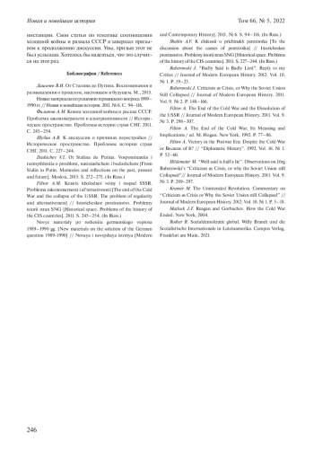 6. Filitov A.M. Konets kholodnoi voiny i raspad SSSR. Problema zakonomernosti i al’ternativnosti [The end of the Cold War and the collapse of the USSR. The problem of regularity and alternativeness] // Istoricheskoe prostranstvo. Problemy istorii stran SNG [Historical space. Problems of the history of the CIS countries]. 2011. S. 245-254. (In Russ.).