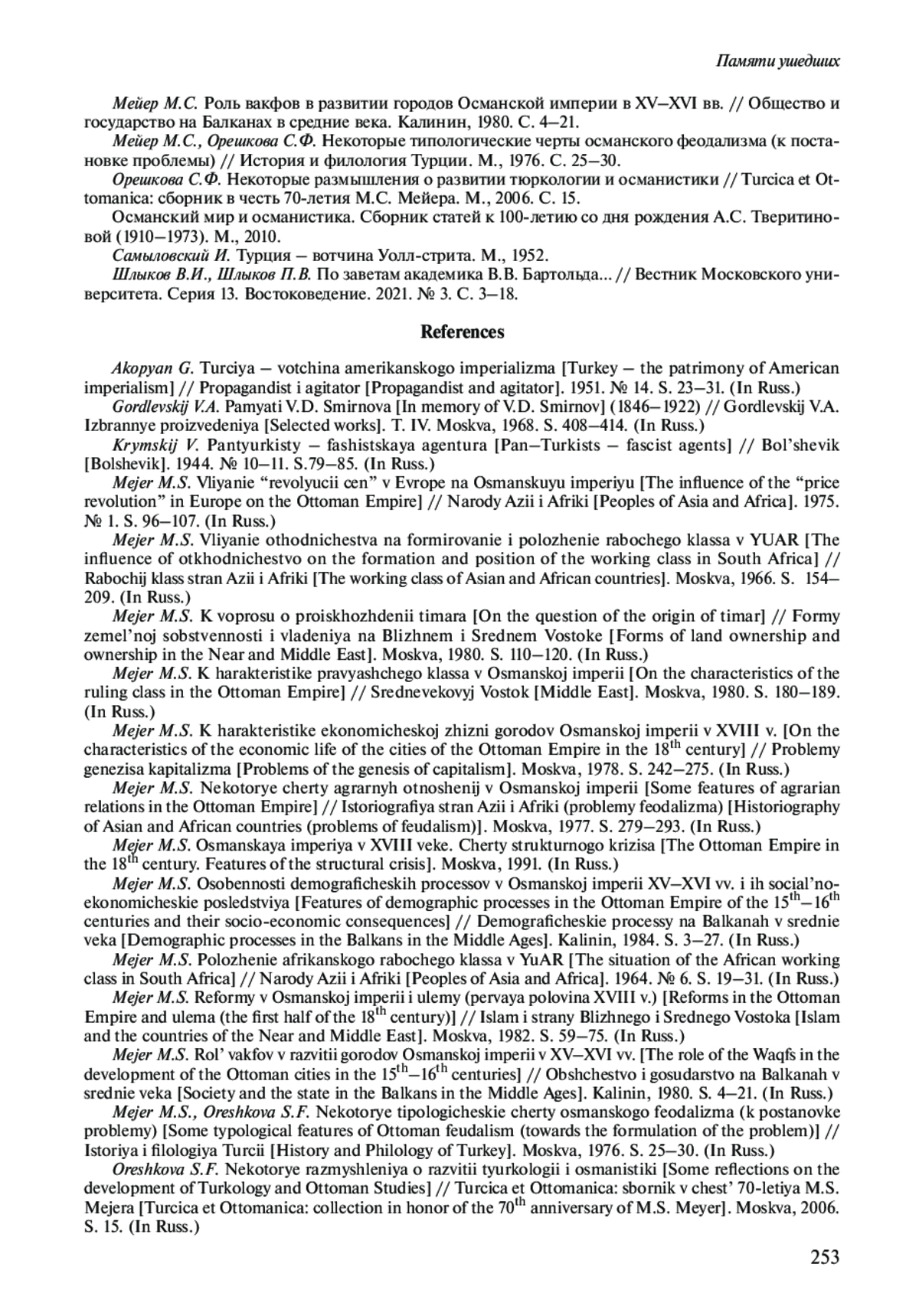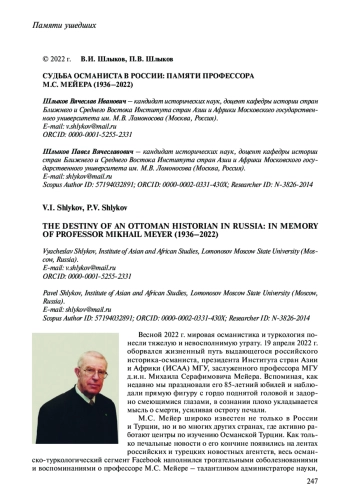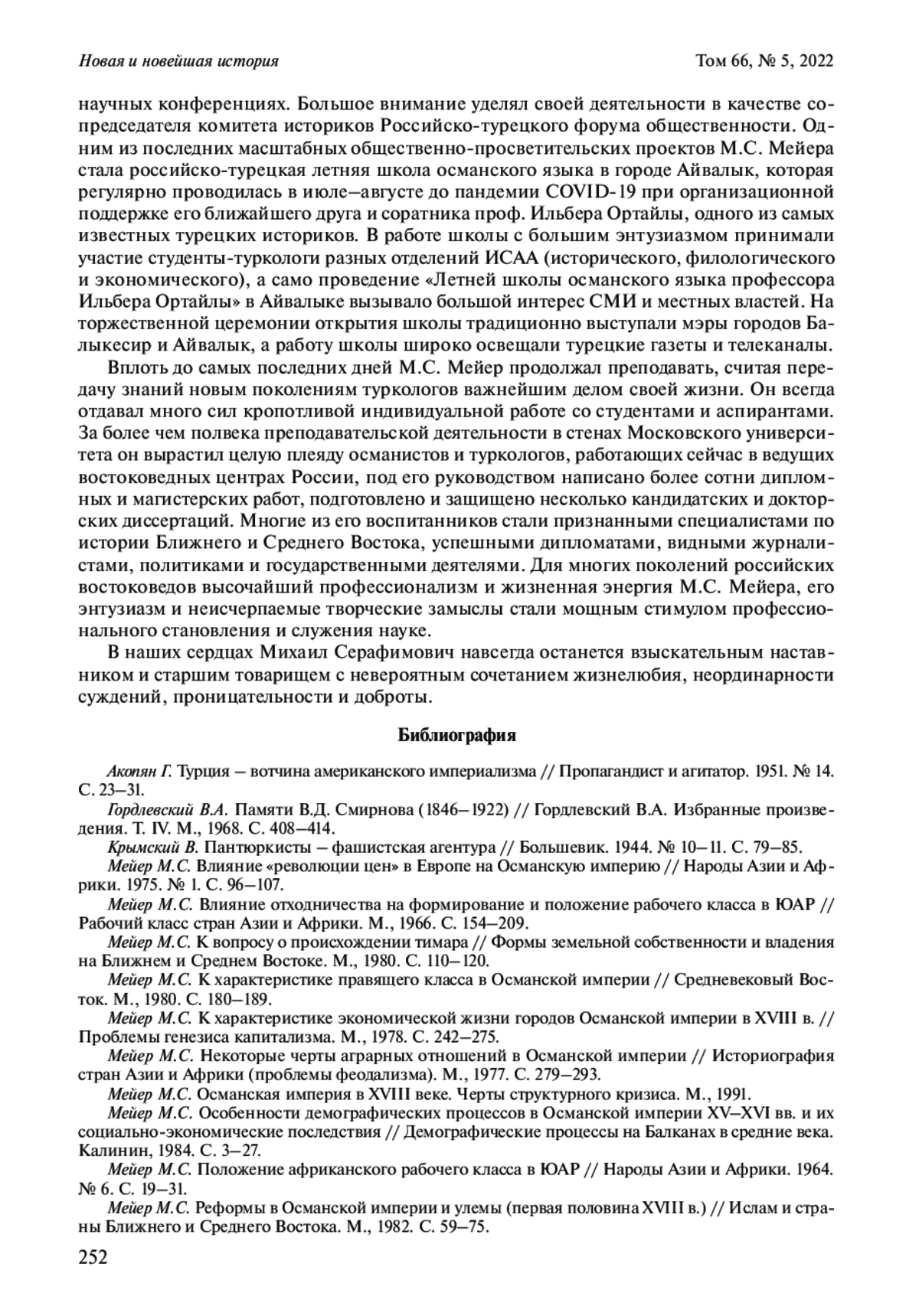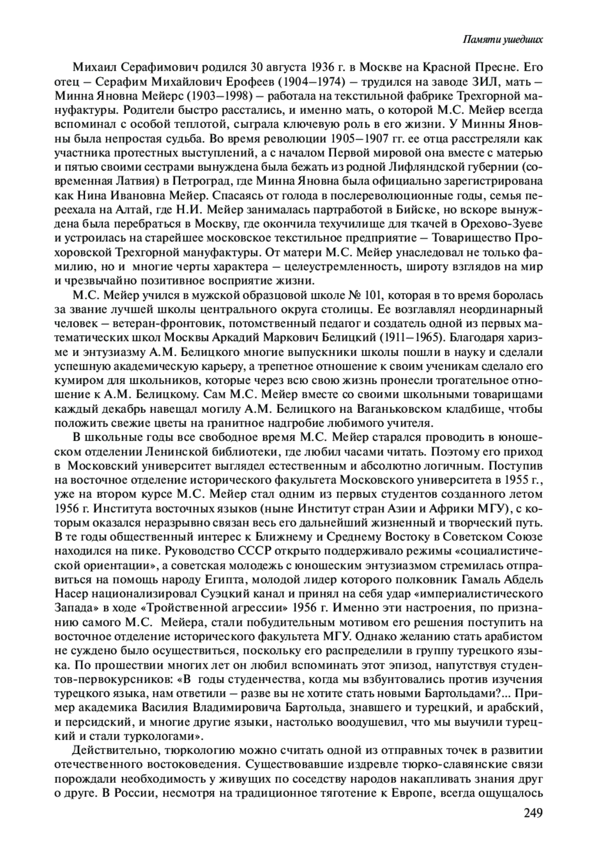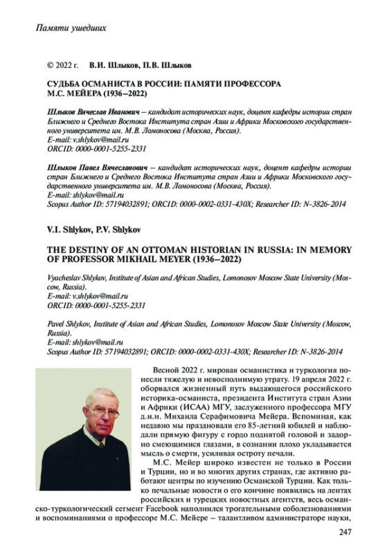 Весной 2022 г. мировая османистика и туркология понесли тяжелую и невосполнимую утрату. 19 апреля 2022 г. оборвался жизненный путь выдающегося российского историка-османиста, президента Института стран Азии и Африки (ИСАА) МГУ, заслуженного профессора МГУ д. и. н. Михаила Серафимовича Мейера. Вспоминая, как недавно мы праздновали его 85-летний юбилей и наблюдали прямую фигуру с гордо поднятой головой и задорно смеющимися глазами, в сознании плохо укладывается мысль о смерти, усиливая остроту печали