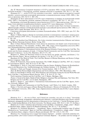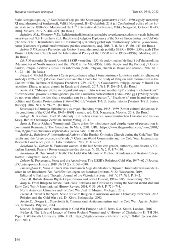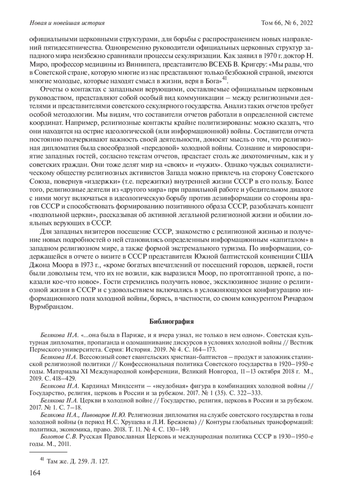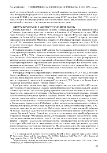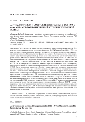 БЕЛЯКОВА Н. А. АНТИКОММУНИЗМ И СОВЕТСКИЕ ЕВАНГЕЛИКИ В 1960-1970-Е ГОДЫ: МЕТАМОРФОЗЫ ОТНОШЕНИЙ В УСЛОВИЯХ ХОЛОДНОЙ ВОЙНЫ // НОВАЯ И НОВЕЙШАЯ ИСТОРИЯ. 2022. № 6