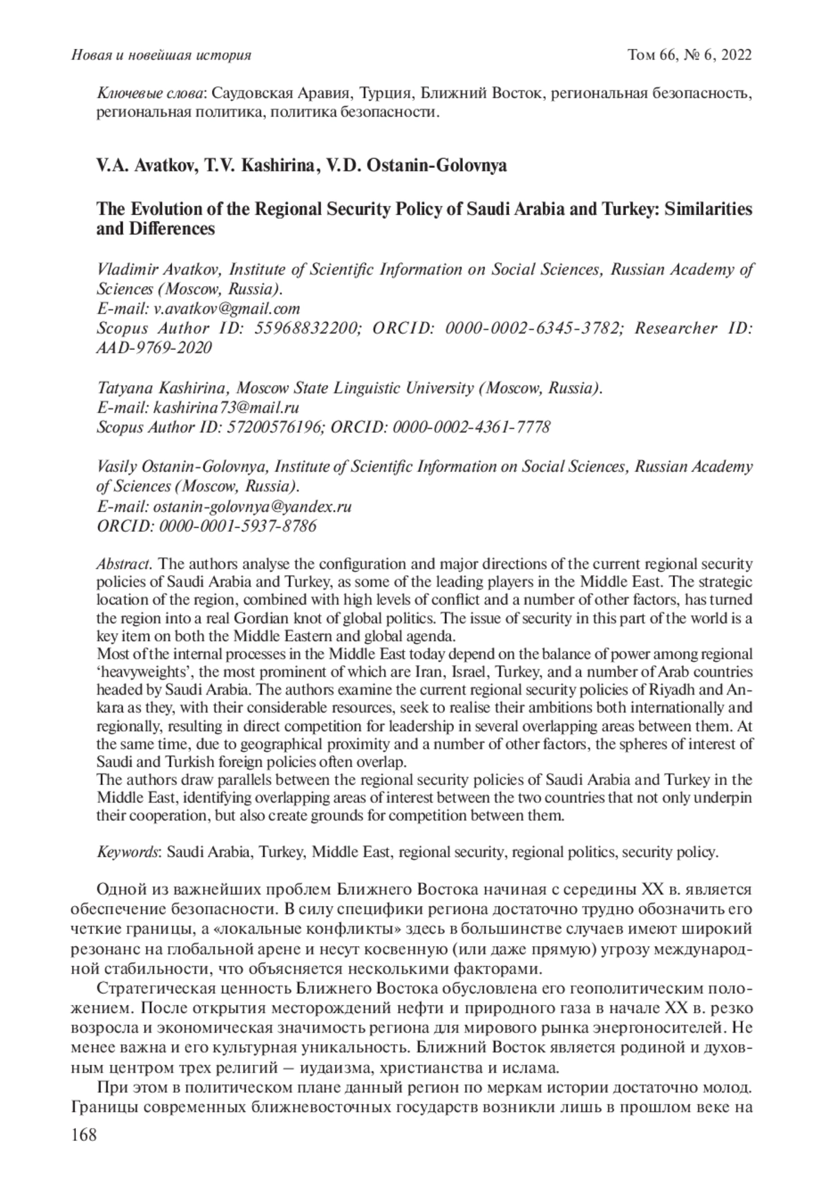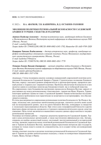 Статья посвящена анализу основных направлений современной политики региональной безопасности Саудовской Аравии и Турции. Стратегическое положение Ближнего Востока, наряду с высоким уровнем конфликтности и другими факторами, превратило данный регион в «гордиев узел» мировой политики. Проблема обеспечения безопасности в нем является одним из ключевых пунктов как ближневосточной, так и глобальной повестки. На современном этапе большинство внутренних процессов на Ближнем Востоке зависит от расстановки сил между региональными «тяжеловесами», такими как Иран, Израиль, Турция, некоторые арабские страны во главе с Саудовской Аравией. Однако комплексные исследования в данном проблемном поле практически не встречаются в историографии, чем обуславливается новизна.