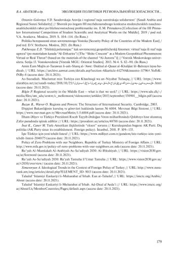 1. Аватков В.А. Идейно-ценностный фактор во внешней политике Турции // Вестник МГИМО-Университета. 2019. Т. 12 (4). С. 113-129. EDN: RAGRDD