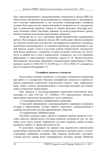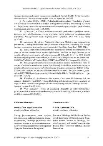 Одной из приоритетных задач в рамках концепции опережающего развития является создание актуальных национальных стандартов по всем отраслям, включая стандартизацию направления «искусственный интеллект», что поднимает проблему качественного перевода национальных и международных стандартов, учитывая насыщенность таких стандартов узконаправленными специфичными терминами, сокращениями, аббревиатурами, числовой информацией, сопровождающейся единицами измерения, которые в определенных случаях требуют грамотного конвертирования в единицы метрической системы принимающего общества. Постулируется важность проведения работы по редактированию, приведению к единому образцу стандартов, идентичных международным, и устранению накопившихся неточностей. Решению этих проблем может способствовать предлагаемая схематическая модель комплексного программного обеспечения по типу ERP-системы, которое бы включало в себя несколько модулей, каждый из которых призван объединять работу переводчика, специалиста по стандартизации и CAT-программы, в частности, в целях обеспечения единства терминологии. Основным элементом данной схематической модели комплексного программного обеспечения становится база данных верифицированных переводов высокого качества. Для оценки качества технического перевода в рамках гипотетической экосистемы избрана количественная система оценки перевода LISA. Предполагаемые преимущества использования предложенного IT-решения: оптимизация и автоматизация работы, прозрачность выполнения рабочих процессов, экономия времени и, как следствие, повышение качества переводов технической документации. Аналогичная система «Росстандарта» «БЕРЕСТА», которая позволяет управлять стандартами на всех этапах жизненного цикла, а также SMART-стандарты, которые активно внедряются на предприятиях экономического сектора, могут послужить основой для разработки и введения IT-решений для переводчиков в сфере технического перевода. При написании статьи использованы общенаучные методы описания, анализа, синтеза и метод моделирования