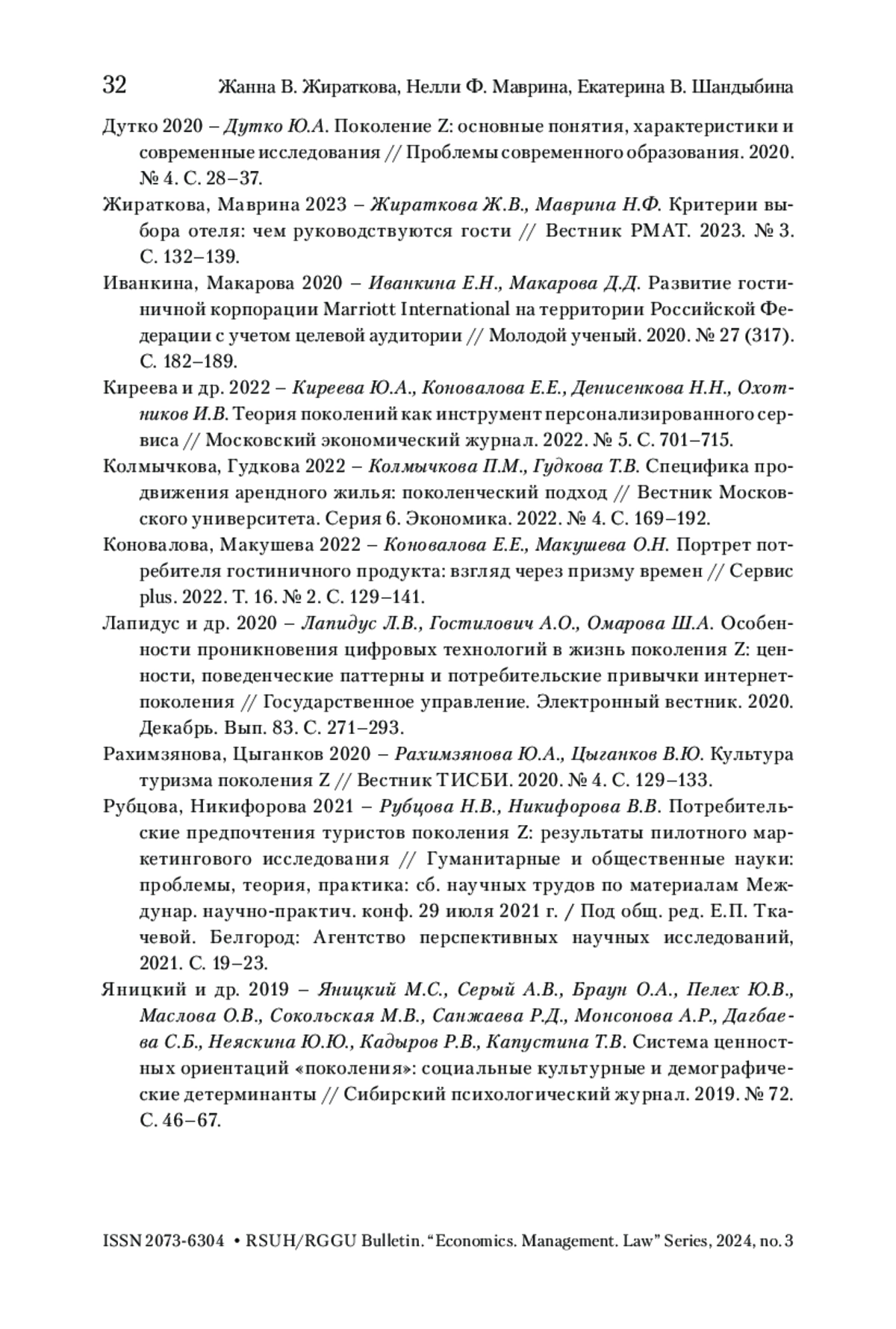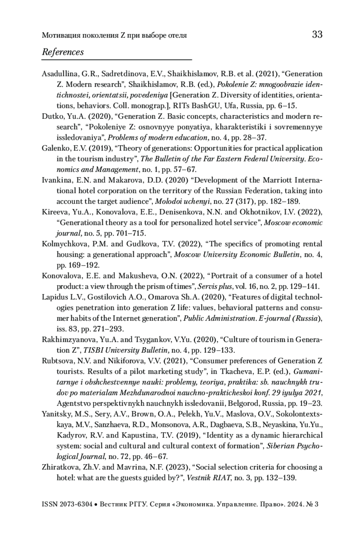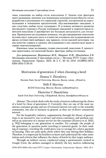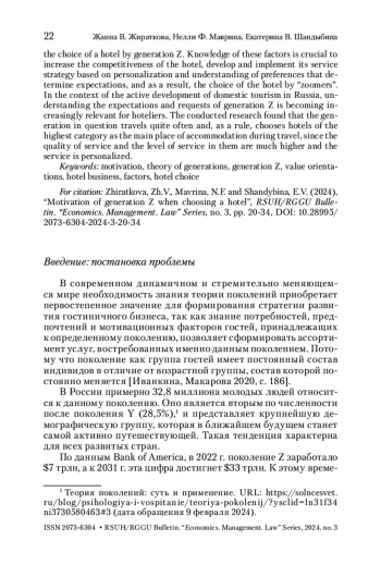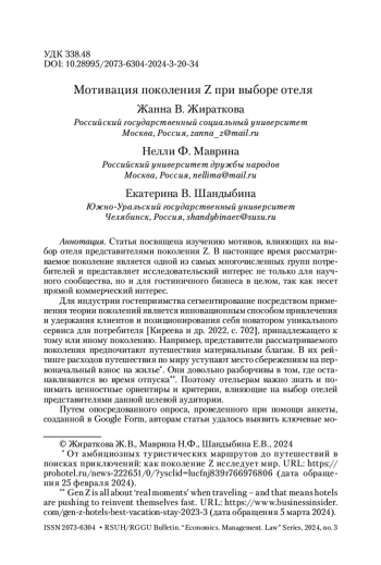 ЖИРАТКОВА Ж. В., МАВРИНА Н. Ф., ШАНДЫБИНА Е. В. МОТИВАЦИЯ ПОКОЛЕНИЯ Z ПРИ ВЫБОРЕ ОТЕЛЯ // ВЕСТНИК РГГУ. СЕРИЯ: ЭКОНОМИКА. УПРАВЛЕНИЕ. ПРАВО. 2024. № 3
