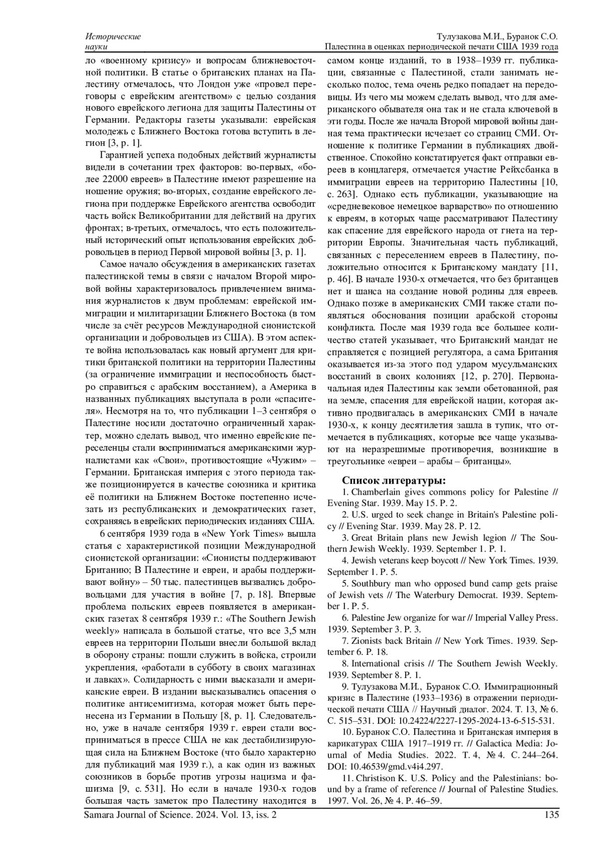 9. Тулузакова М.И., Буранок С.О. Иммиграционный кризис в Палестине (1933-1936) в отражении периодической печати США // Научный диалог. 2024. Т. 13, № 6. С. 515-531. DOI: 10.24224/2227-1295-2024-13-6-515-531 EDN: KGWZIC