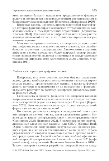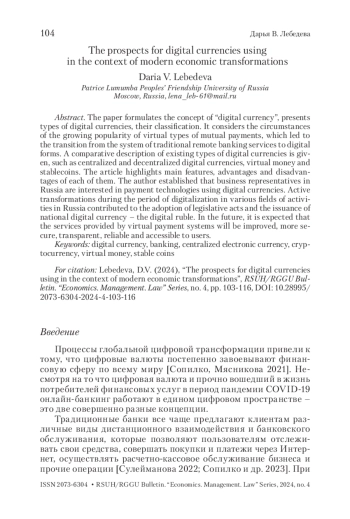 В работе сформулировано понятие «цифровая валюта», представлены виды электронных валют, их классификация. Рассмотрены обстоятельства роста популярности виртуальных типов взаиморасчетов, которые вызвали переход от системы традиционного дистанционного банковского обслуживания к цифровым формам. Дана сравнительная характеристика существующих типов цифровых валют, таких как централизованные и децентрализованные цифровые валюты, виртуальные деньги и стейблкоины (стабильные монеты). Выделены основные особенности, преимущества и недостатки каждого из них. Установлено, что у представителей бизнеса в России наблюдается всплеск интереса к применению платежных технологий с использованием цифровых видов валют. Активные преобразования в период цифровой трансформации в различных сферах деятельности в Росси способствовали принятию законодательных актов и выпуску собственной цифровой валюты – цифрового рубля. В будущем ожидается, что услуги, предоставляемые виртуальными платежными системами, будут усовершенствованы, станут более безопасными, прозрачными, надежными и доступными для пользователей.