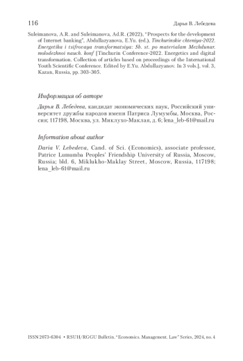 8. Извекова, Митковская 2020 - Извекова А.Д., Митковская А.Д. Современный этап развития интернет-банкинга в системе дистанционного банковского обслуживания // Вектор экономики. 2020. № 6 (48). С. 52-58.