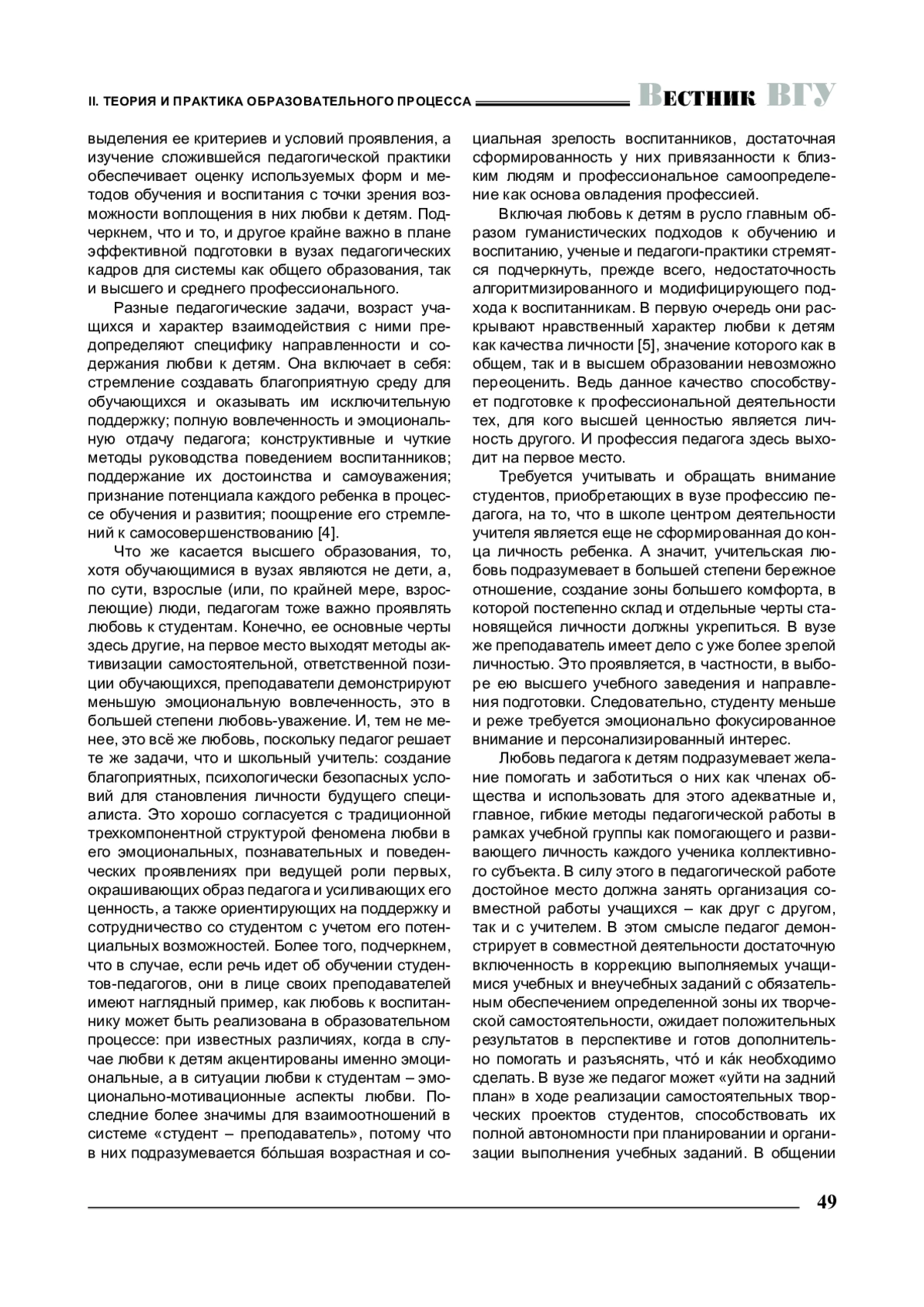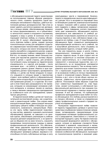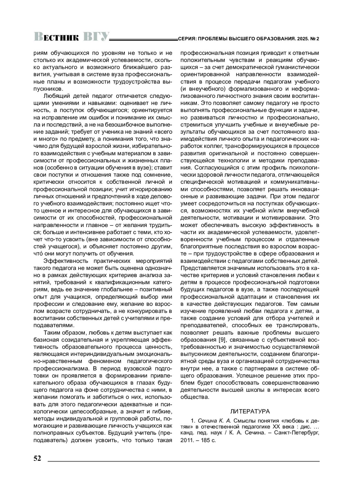 ЛИСОВА Е. Н., ТЫНКОВАН Н.А. ЛЮБОВЬ К ДЕТЯМ КАК ПСИХОЛОГИЧЕСКИЙ ФЕНОМЕН И АКСИОЛОГИЧЕСКИЙ ФОКУС ПОДГОТОВКИ ПЕДАГОГОВ В ВУЗЕ // ВЕСТНИК ВОРОНЕЖСКОГО ГОСУДАРСТВЕННОГО УНИВЕРСИТЕТА. СЕРИЯ: ПРОБЛЕМЫ ВЫСШЕГО ОБРАЗОВАНИЯ. 2025. № 2