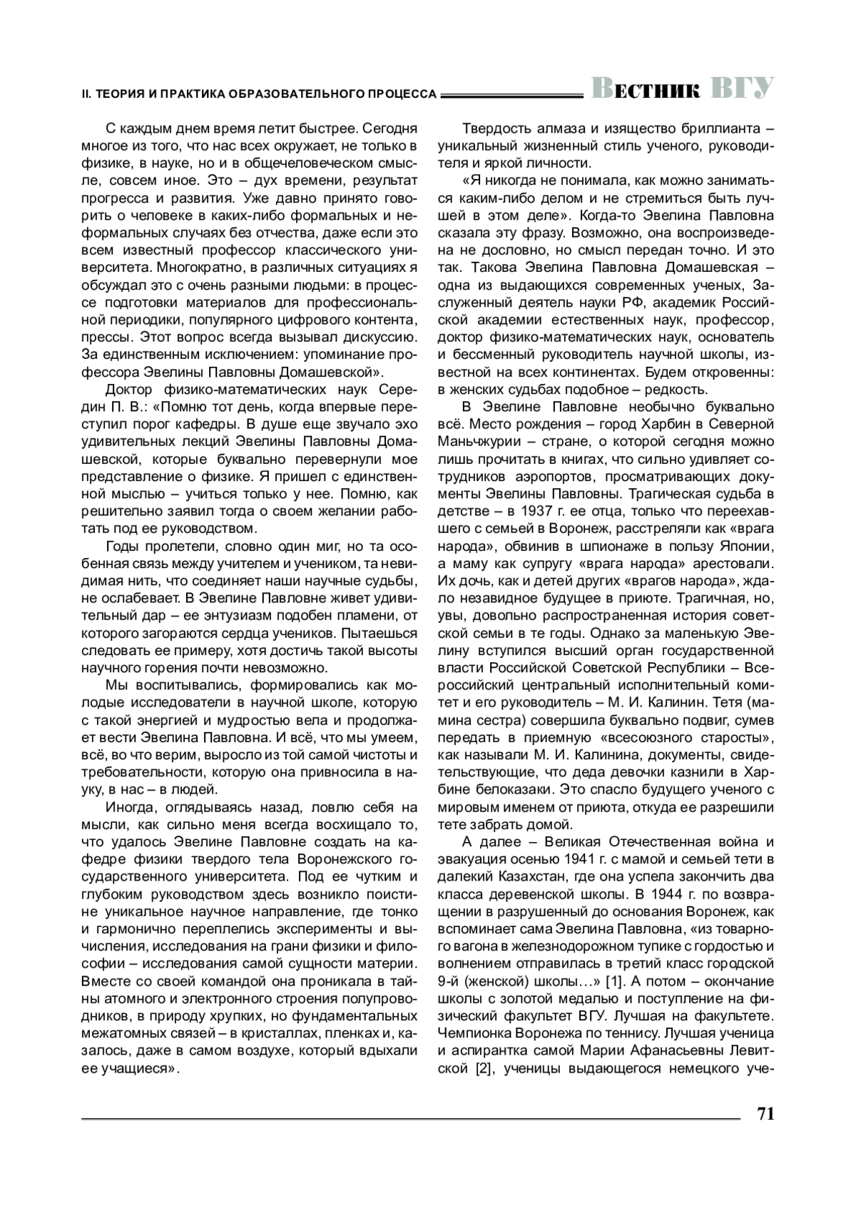 Статья посвящена уникальному человеку, физику, ученому с мировым именем, незаурядному педагогу и основателю известной во всем мире научной школы Воронежского государственного университета профессору Эвелине Павловне Домашевской. Яркие и важные моменты биографии ученого и учителя приводятся наряду с оригинальными и особенными штрихами многогранной деятельности и достижений Эвелины Павловны для науки, образования и университета.