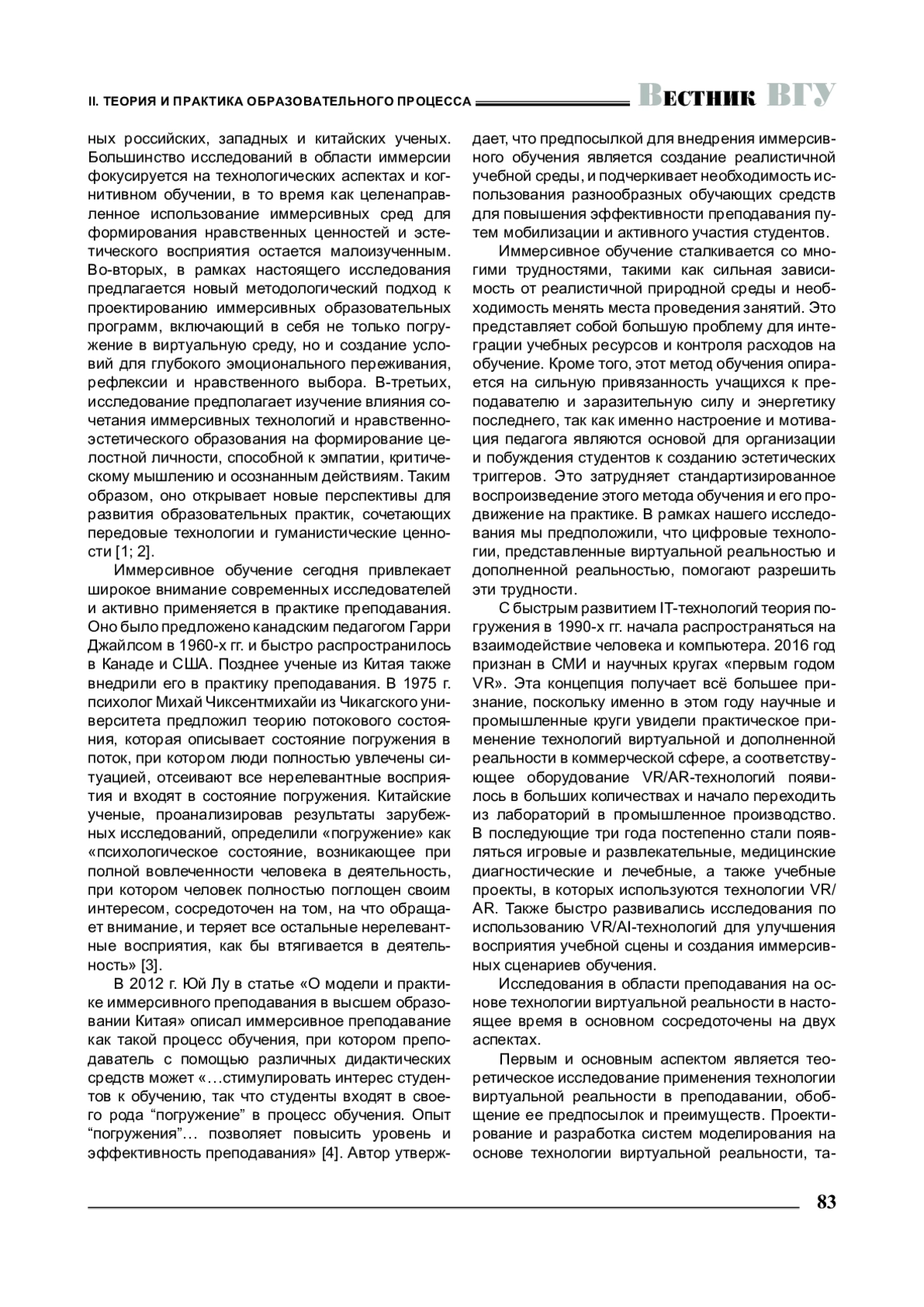 6. 周屹. 全沉浸式VR技术在高校艺术设计专业实验教学的改革与实践 // 高教学刊. - 2020. - № 24. -C. 139-146. [Чжоу И. Реформа и практика использования технологии полного погружения в виртуальную реальность в экспериментальном преподавании искусства и дизайна в колледжах и университетах /И. Чжоу // Журнал высшего образования. - 2020. -№ 24. - C. 139-146.].