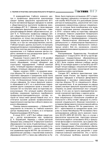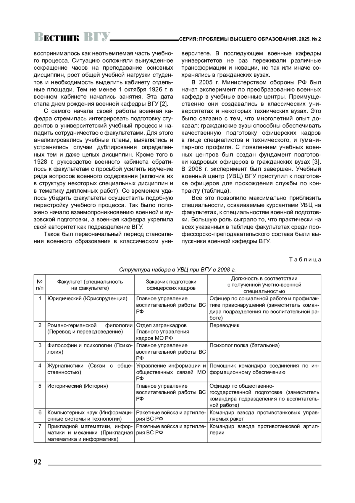 Сегодня ВГУ является единственным гражданским вузом России, где ведется подготовка кадровых офицеров в интересах Департамента информации и массовых коммуникаций Министерства обороны РФ по специальности «Военная журналистика». В ее реализации на равных правах участвуют факультет журналистики и ВУЦ, опираясь на ранее накопленный опыт сотрудничества. И это уже не просто взаимодействие военной и вузовской подготовки, а единое целое. На факультете философии и психологии на базе специальности «Психология служебной деятельности» в ВУЦ готовят офицеров по учетновоенной специальности «Военная психология» в интересах Департамента психологической работы Министерства обороны РФ.