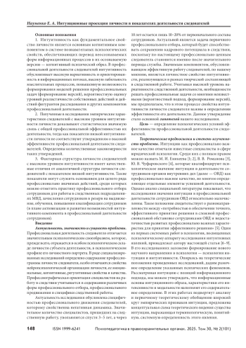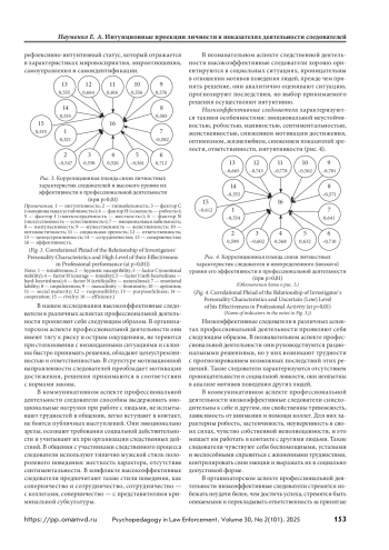 Интуиция представляет собой фундаментальное психологическое явление, которое реализуется в различных формах активности человека, оказывая влияние на способы ее организации и продуктивность. Цель — определение психологических условий влияния интуиции на эффективность профессиональной деятельности следователей. Материалы и методы. Использованы авторские методики определения интуиционного потенциала личности. Эффективность профессиональной работы следователей определялась методом экспертной оценки по предложенным квалификационным требованиям и реальной оценки успешности работы. Выборку составили 292 следователя различной ведомственной подчиненности. Результаты и обсуждение. Приводятся результаты количественного и качественного анализа фактологических данных. На основе факторного моделирования определены модели личности эффективного и неэффективного следователя, построены графические модели корреляционных отношений свойств и качеств личности следователей в зависимости от уровня проявления свойств интуитивности. Выводы. Фактор интуитивности личности определяет успешность и эффективность профессиональной деятельности следователя. В личности высокоинтуитивных и низкоинтуитивных следователей имеются содержательные отличия, которые могут служить основанием для оценки, профессионального отбора, профессиональной пригодности специалистов для работы в должности следователей.