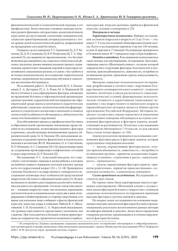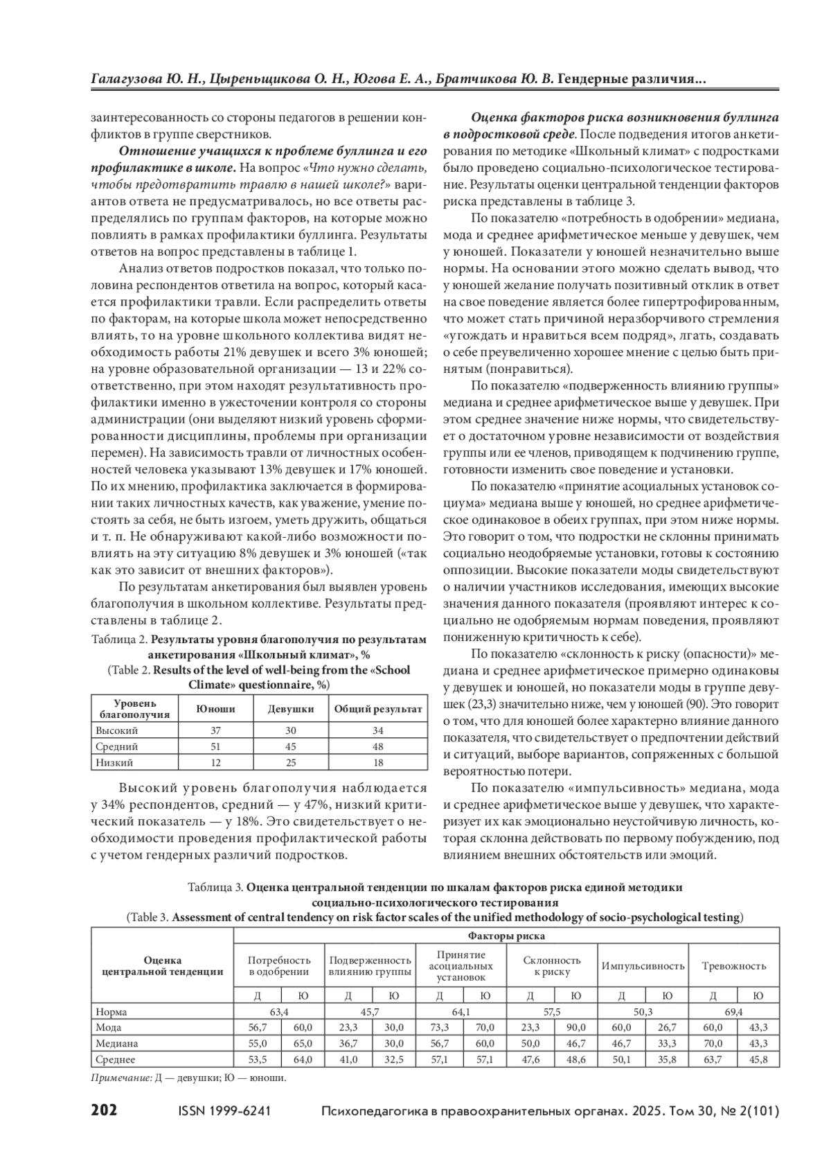 Недостаточная изученность влияния гендерных различий на поведение всех участников буллингструктуры (агрессоров, их жертв, сторонних наблюдателей) сдерживает разработку профилактических мер, призванных оказать помощь подросткам в условиях буллинга, предупредить насилие и травлю в системе образования. Цель — определение гендерных различий проявления факторов буллинга у подростков в общеобразовательной организации, в условиях малого города. Материалы и методы. Для реализации поставленной цели использовались методы анкетирования (адаптированная методика «Школьный климат») и тестирования (Единая методика социально-психологического тестирования). Результаты и обсуждение. В подростковом возрасте юноши и девушки одинаково склонны к проявлению агрессии, однако содержательные характеристики такого поведения (вид агрессии, степень выраженности факторов буллинга) проявляются по-разному. Девочки с позитивными установками в отношении буллинга ориентированы в большей степени на соперничество, применяя вербальную агрессию, воздействие через виртуальную среду. Юноши с позитивными установками в отношении буллинга предпочитают физическую агрессию, видят результативность профилактики буллинга в ужесточении контроля со стороны администрации. Выводы. Для юношей фактором риска чаще является склонность к риску, фактором защиты от буллинга — социальная активность. Для девушек факторами риска возникновения буллинга выступают импульсивность и тревожность; факторами защиты от буллинга — принятие родителями и принятие одноклассниками, что расширяет представление о специфике и гендерных различиях выраженности факторов буллинга в старшем подростковом возрасте. Результаты опытно-поисковой деятельности позволяют выработать стратегии первичной профилактики с учетом гендерных различий: к работе с девушками важно подключать родителей, а для юношей необходимо организовать возможность их участия в общественно полезных делах.