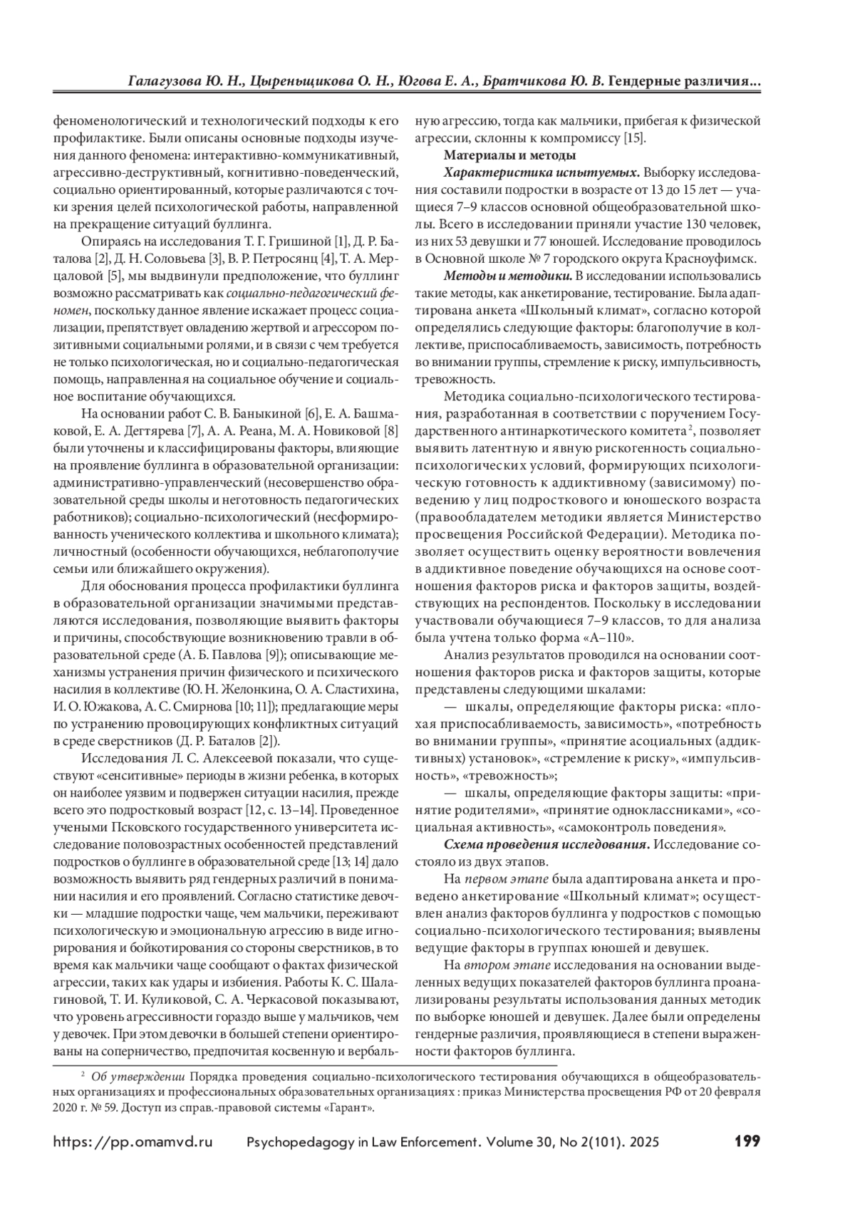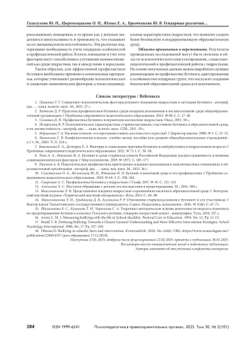 1. Гришина Т. Г. Социально-психологические факторы ролевого поведения подростков в ситуации буллинга : автореф. дис. … канд. психол. наук. М., 2021. 27 с.