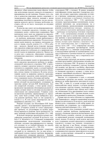 В статье актуализируется проблема формирования ценностного отношения курсантов ведомственного вуза ФСИН России к человеку как личностному образованию, обладающему структурой, включающей когнитивный, мотивационно-оценочный, эмоциональный и деятельностный компоненты. Обосновывается возможность использования объяснения, работы с текстом (книгой), убеждающего воздействия, беседы, дискуссии, ценностно-смыслового диалога, задач с ценностным содержанием, метода анализа конкретной ситуации, метода решения ситуации, ролевой игры в качестве методов формирования ценностного отношения курсантов ведомственного вуза ФСИН России к человеку. Раскрываются результаты реализации указанных методов. 1) Метод объяснения позволяет предъявлять курсантам знание о том, что есть ценность, ценностное отношение к человеку не только на уровне информации, но на уровне понимания; 2) метод работы с текстом (книгой) обеспечивает вооружение курсантов знаниями, образующими содержание когнитивного компонента ценностного отношения к человеку; 3) метод убеждающего воздействия способствует тому, что знание о ценности, о человеке и др. воспринимается курсантами не только на уровне информации, но и ложится в основу идейно-нравственных принципов личности курсанта; 4) метод ценностно-смыслового диалога обеспечивает осознание и присвоение курсантом как значимых еще недостающих курсанту ценностей; 5) метод задачи с ценностным содержание позволяет курсантам самим вычленить ценности в содержании задачи, обосновав свой выбор; 6) метод ролевой игры обеспечивает ориентацию на реализацию соответствующих отношений во взаимодействии с другими людьми. Приводятся примеры использования данных методов в образовательном процессе ведомственного вуза ФСИН России.