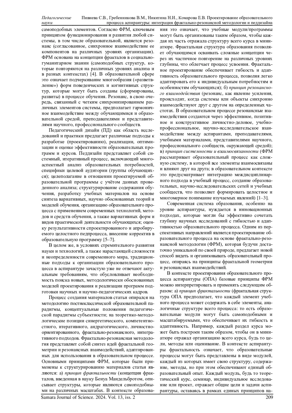 Современная система образования характеризуется возрастающими требованиями к качеству и результативности образовательного процесса (в том числе и в аспирантуре), что актуализирует необходимость использования научно обоснованных методологических подходов к проектированию и реализации образовательных программ. В этом контексте особое значение приобретает интеграция фрактально-резонансной методологии (ФРМ) и концепции педагогического дизайна (ПД). В статье рассмотрены механизмы синтеза необихевиористического, когнитивистского и конструктивистского подходов в рамках теории и практики педдизайна, а также три ключевых подхода к педпроектированию в концепции педдизайна: «от задачи», «от типа деятельности» и «от образовательных результатов», проанализированы их особенности, преимущества и ограничения. Фрактально-резонансная методология (ФРМ) проектирования образовательного процесса основывается на принципах, заимствованных из теории фракталов и концепции резонанса. В статье рассмотрена сущность данной методологии, ее ключевые аспекты, принципы, возможности и дидактические механизмы реализации в образовательном процессе аспирантуры. В содержании статьи анализируется, как применение четырёхкомпонентной модели дизайна обучения (4С/ID), основанной на теории когнитивной нагрузки Эдварда Свеллера и теории мультимедийного обучения Ричарда Майера, может улучшить образовательный процесс в аспирантуре и помочь обучающимся эффективно справляться с изучаемыми темами.